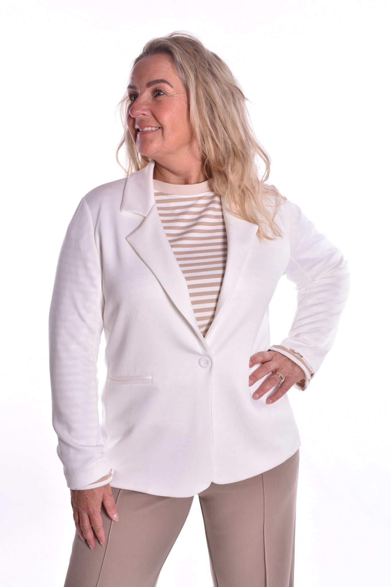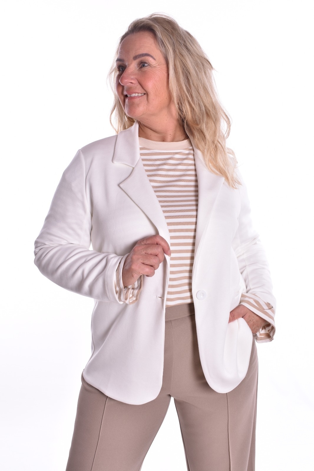 Blazer bianca is een hele zachte blazer van stretch stof met een knoopsluiting. De blazer is niet gevoerd.