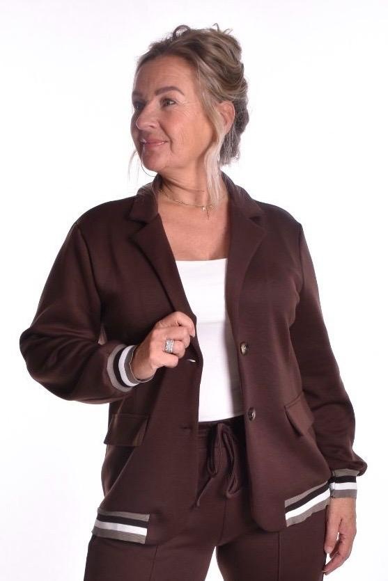 Aan de mouwen en aan de onderkant van de blazer zit een 4 kleurige brede band.