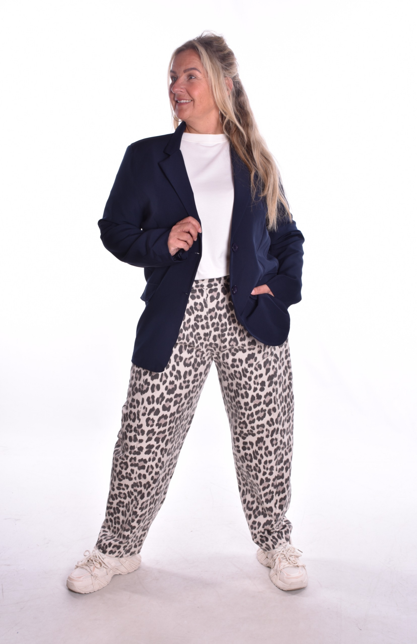 Ons model heeft maat 40, is 165 cm lang en draagt de maat L.