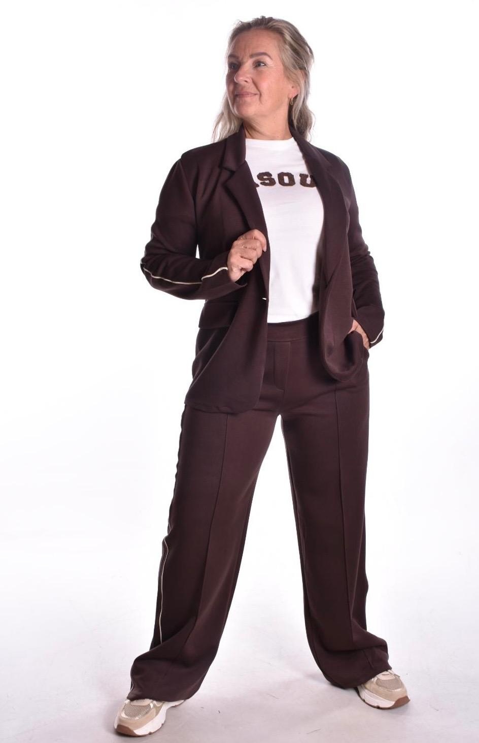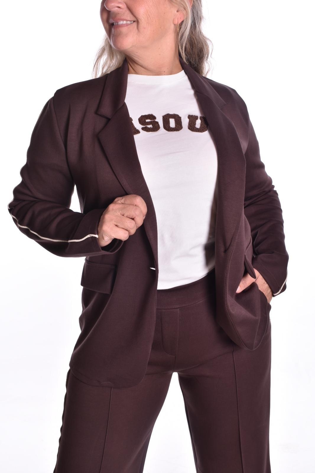 Blazer Lynn is van een zachte stof met veel stretch en een witte bies op de mouwen, 2 nep klepzakjes en een knoopsluiting met 1 knoop.