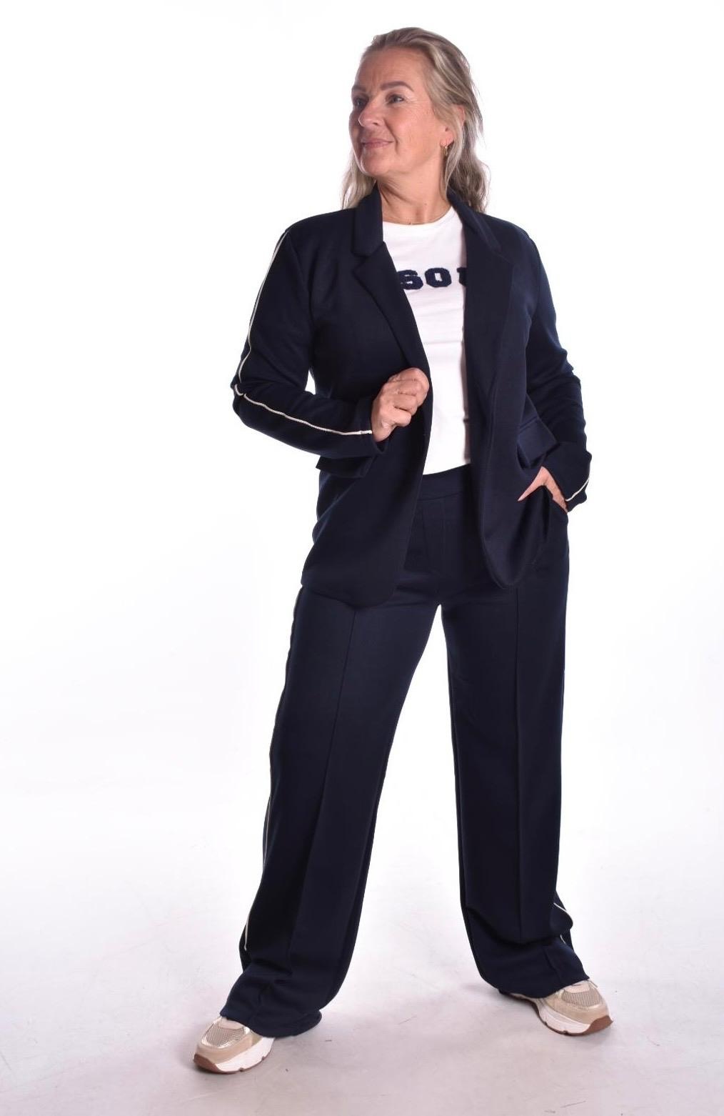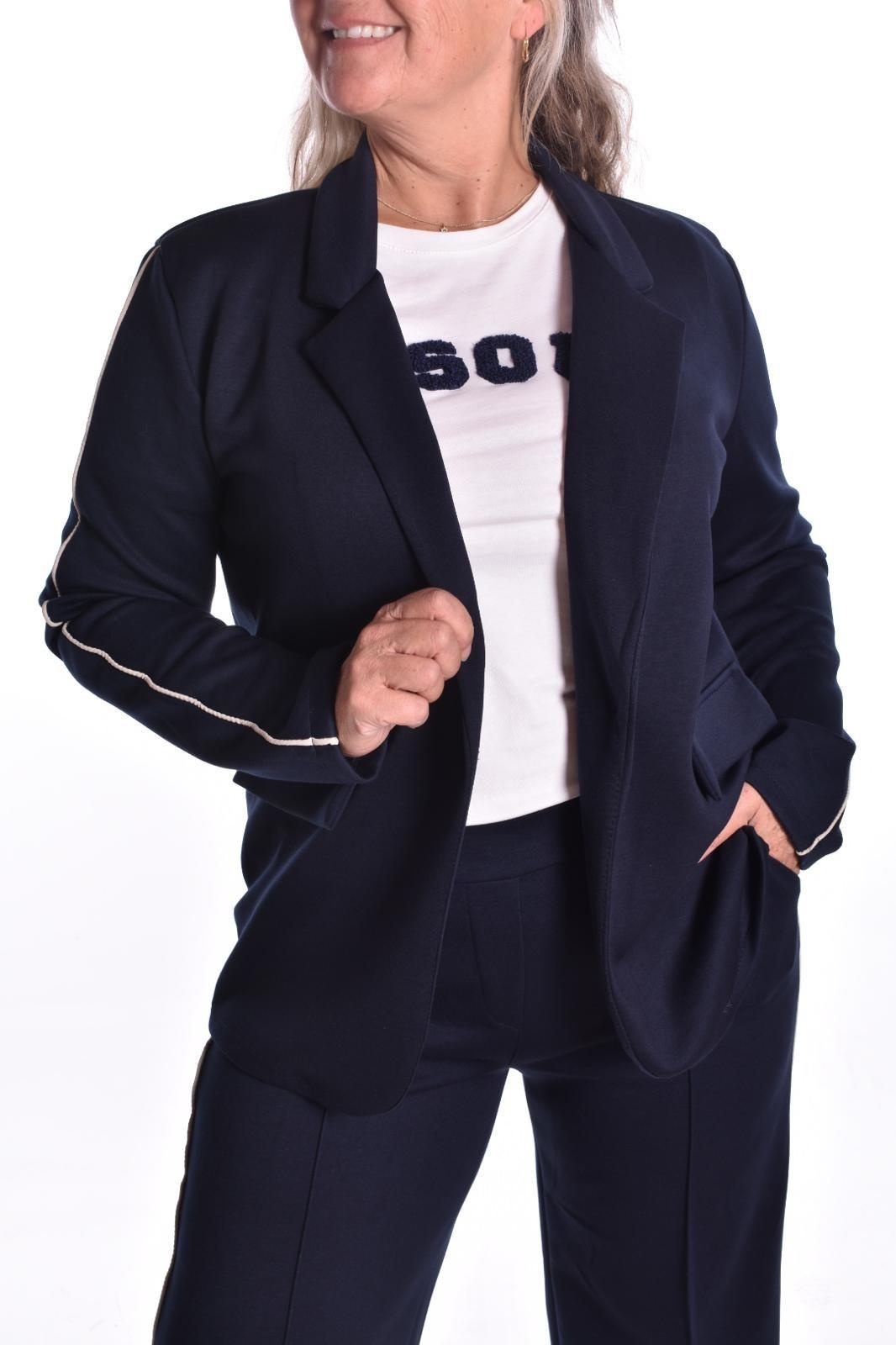Blazer Lynn is van een zachte stof met veel stretch en een witte bies op de mouwen, 2 nep klepzakjes en een knoopsluiting met 1 knoop.