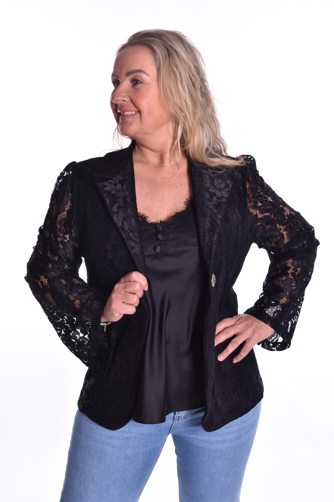 Blazer Romance is een kanten gevoerde blazer met een knoopsluiting.