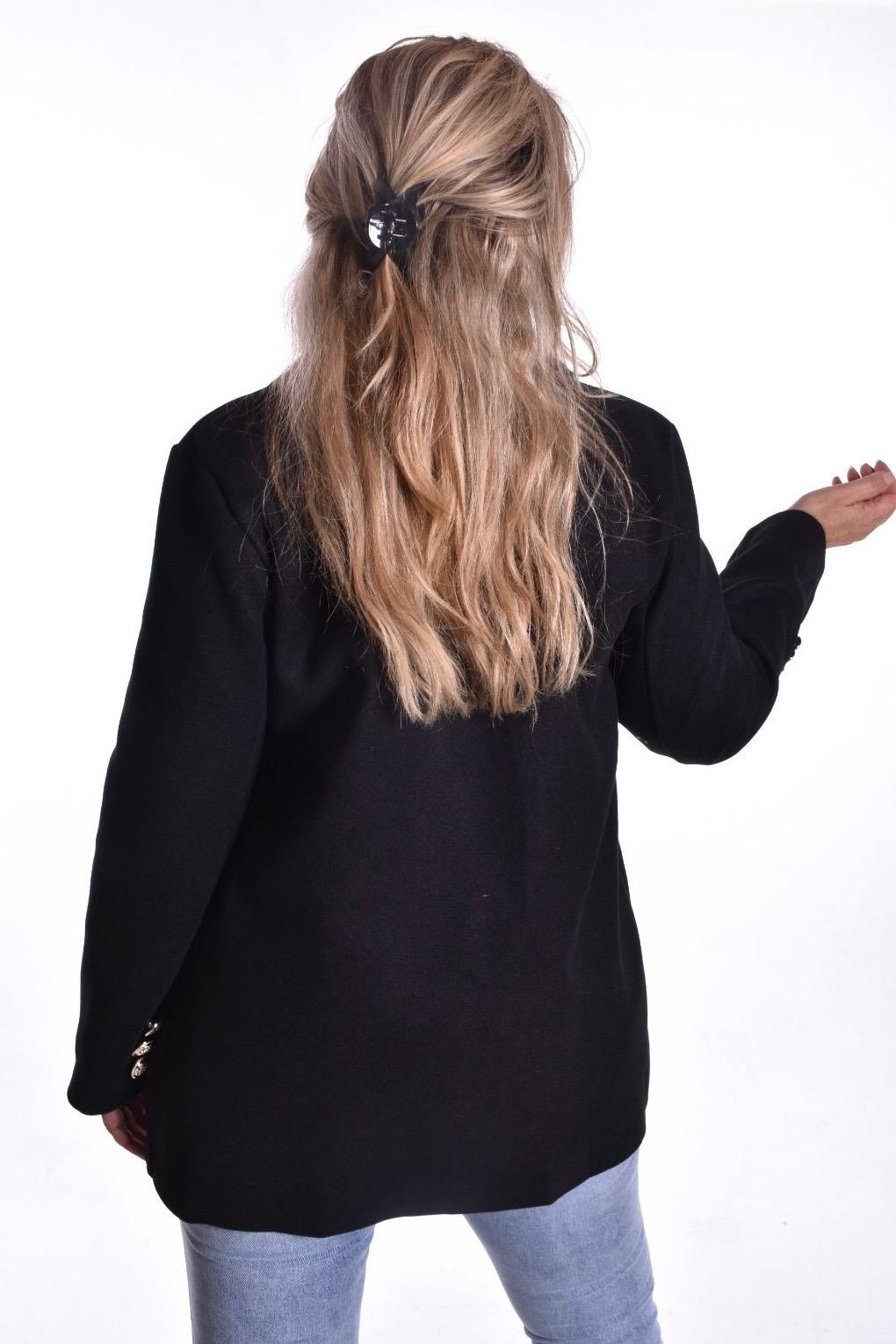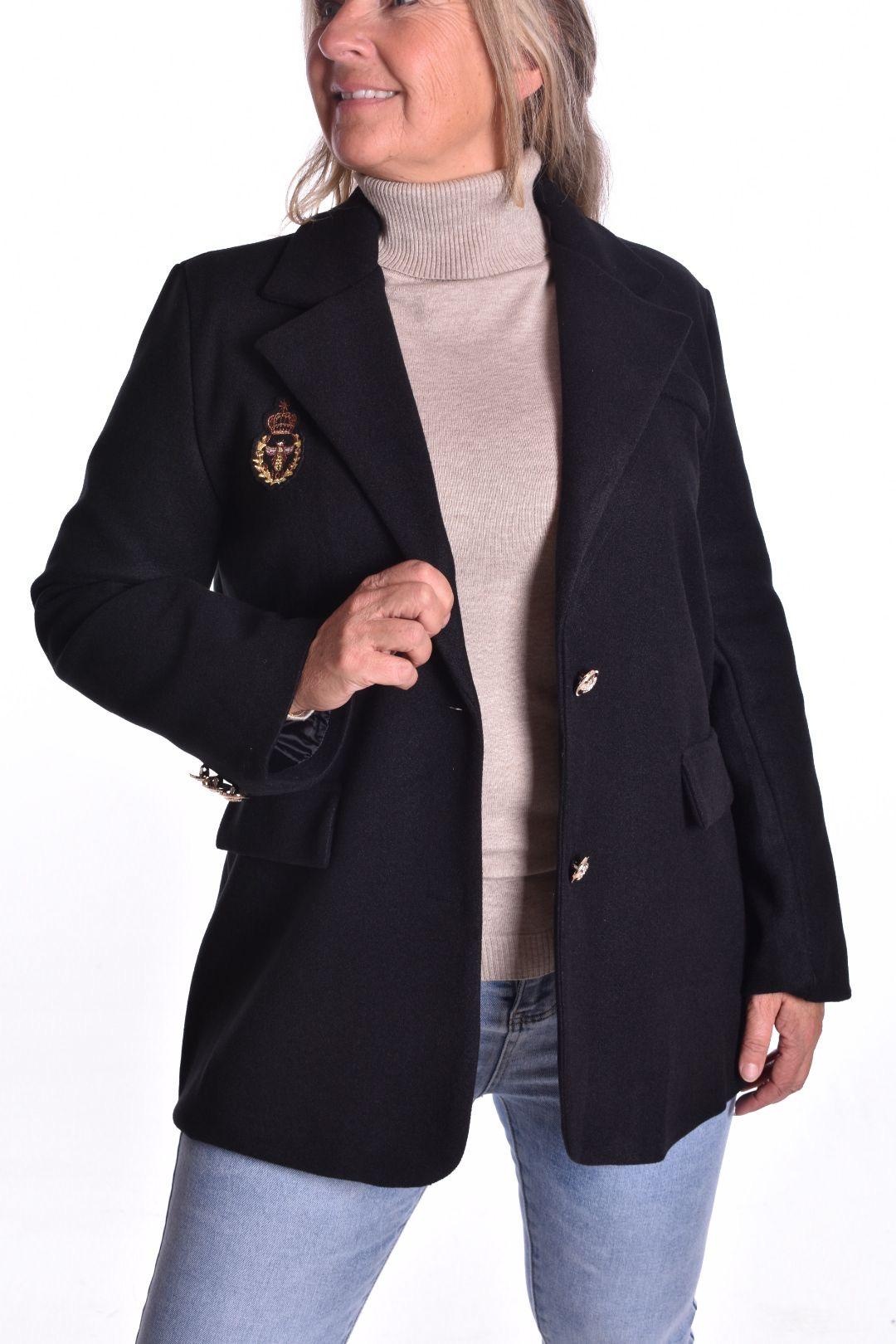 De blazer is een dikke gevoerde blazer met een embleem en heeft een knoopsluiting.