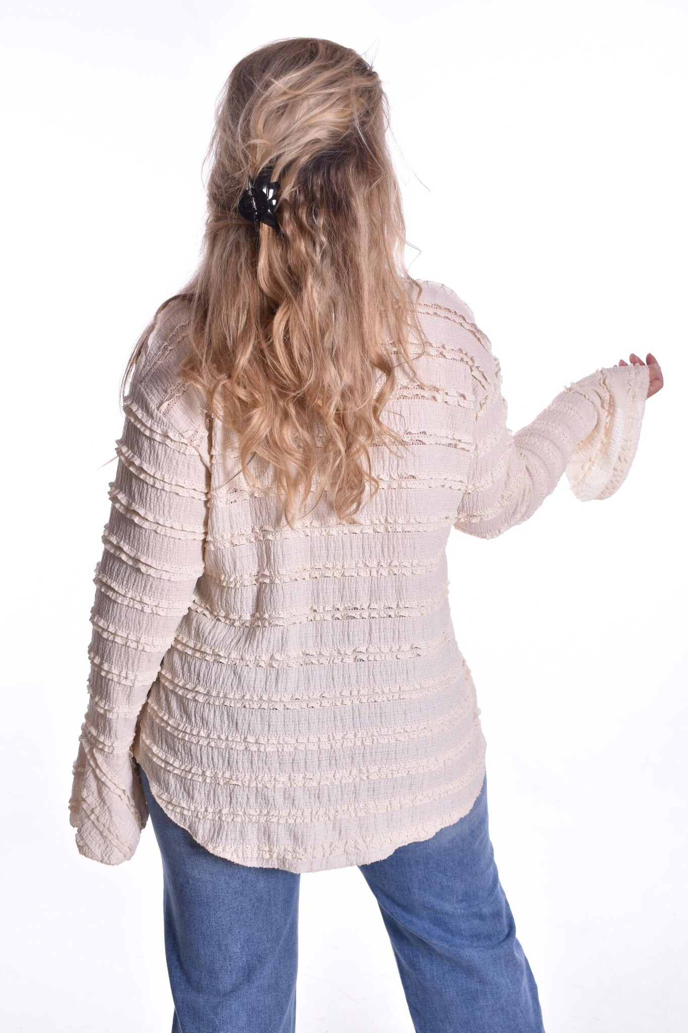 Blouse Emilia is een door geknoopte blouse met uitlopende manchetten en een leuke stof met randjes en stretch.