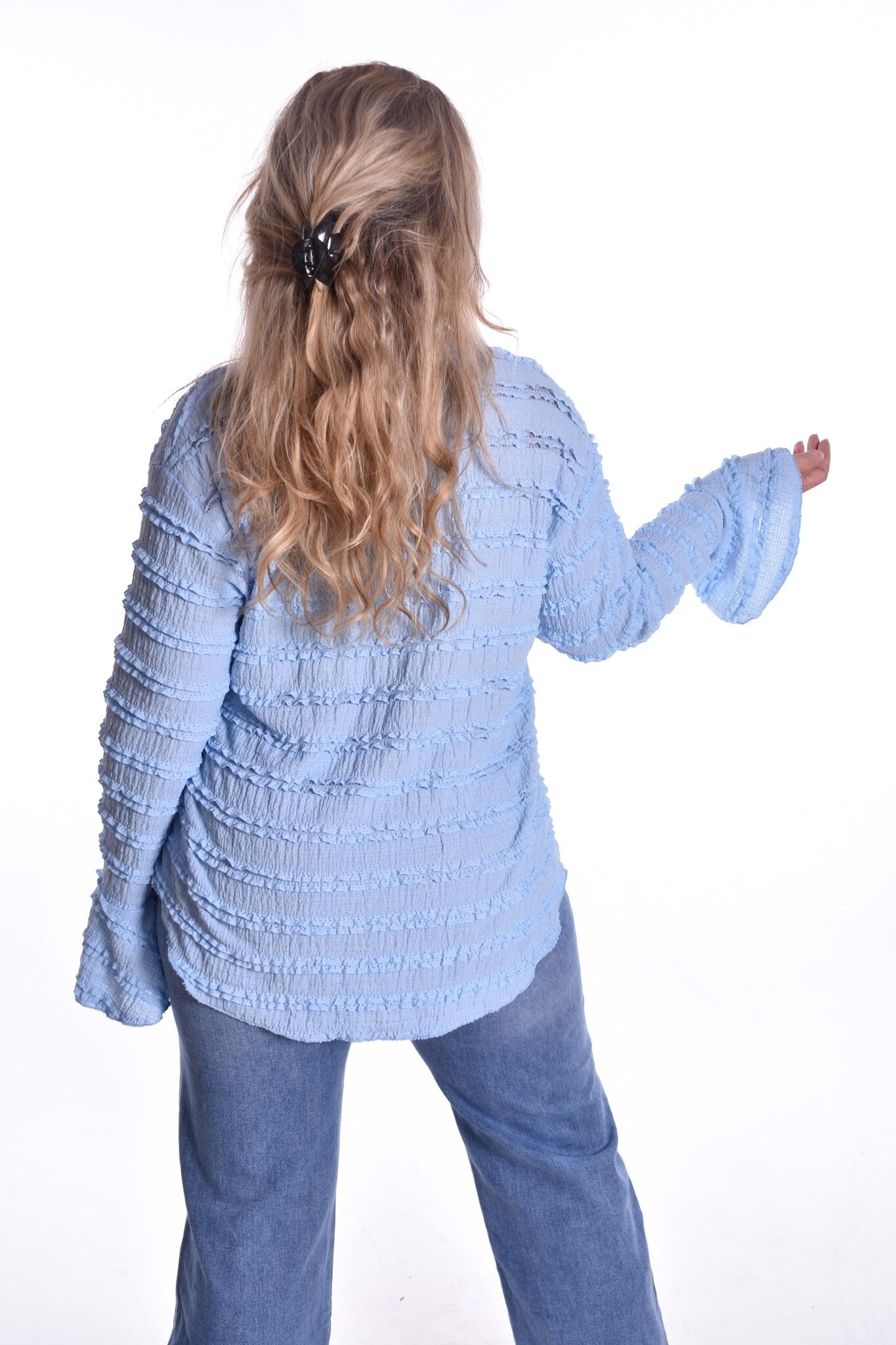 Blouse Emilia is een door geknoopte blouse met uitlopende manchetten en een leuke stof met randjes en stretch.