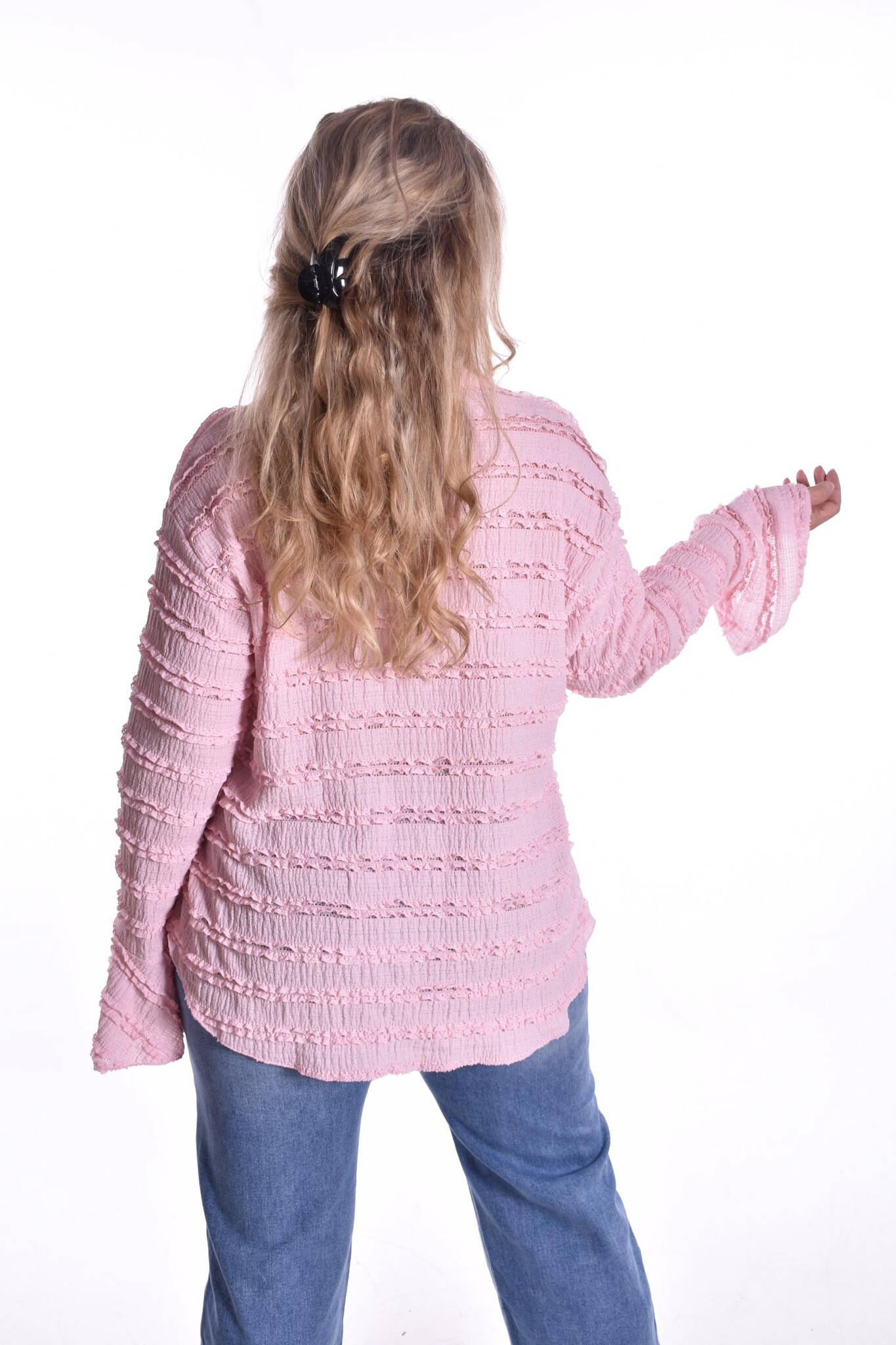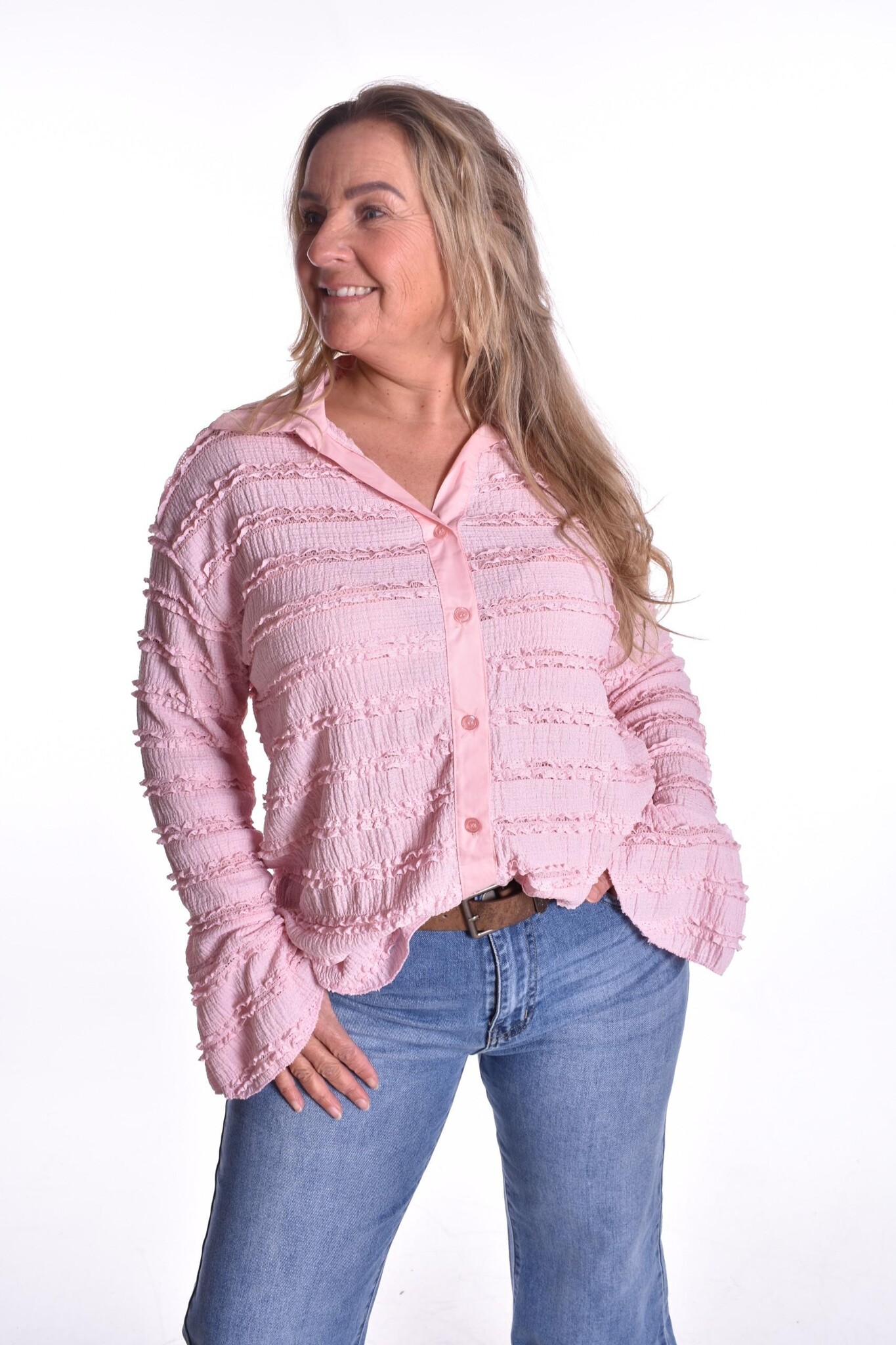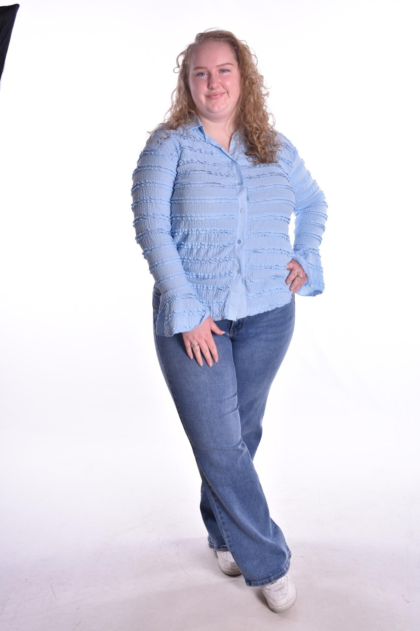 Blouse Emilia is een door geknoopte blouse met uitlopende manchetten en een leuke stof met randjes en stretch.