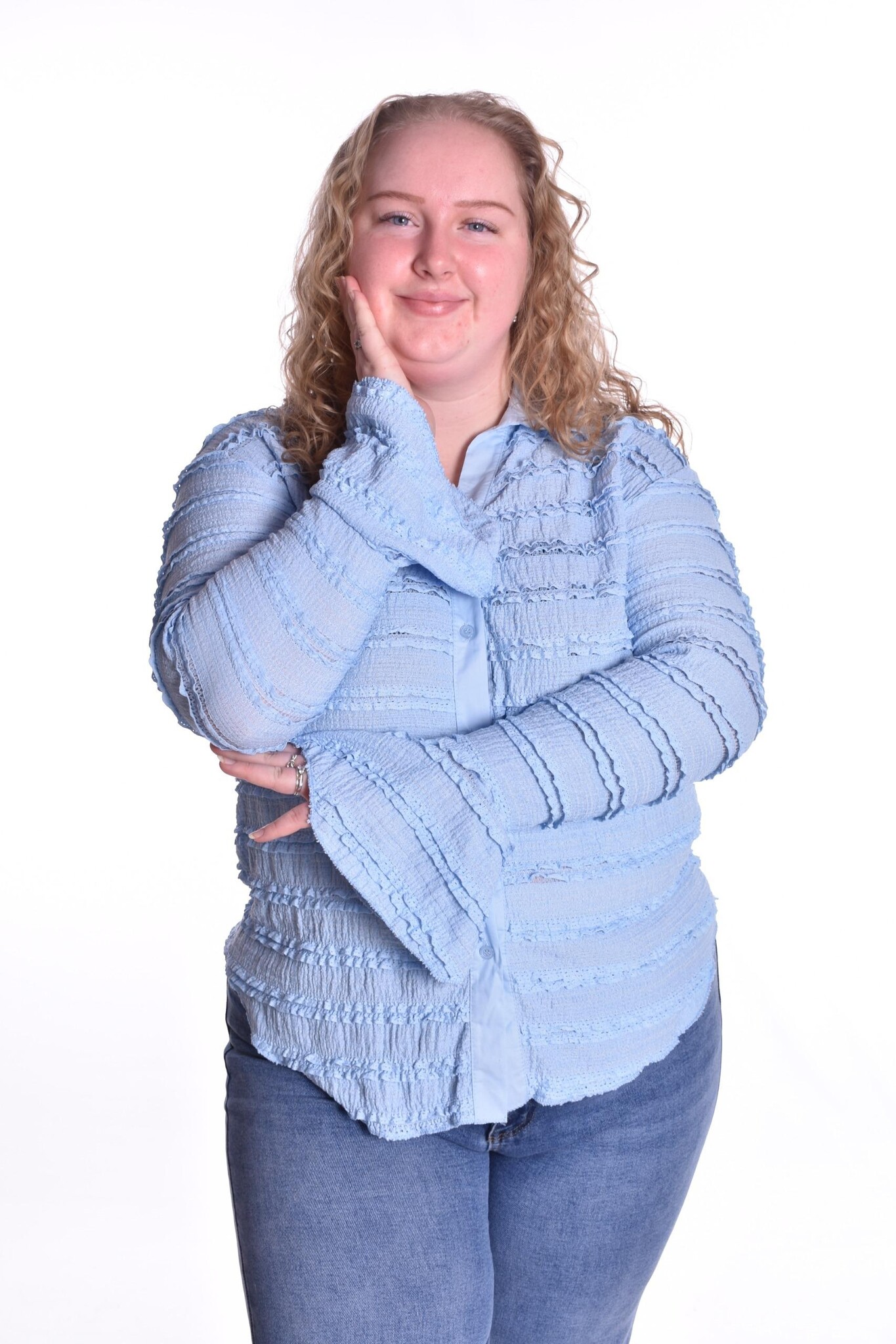 Blouse Emilia is een door geknoopte blouse met uitlopende manchetten en een leuke stof met randjes en stretch.