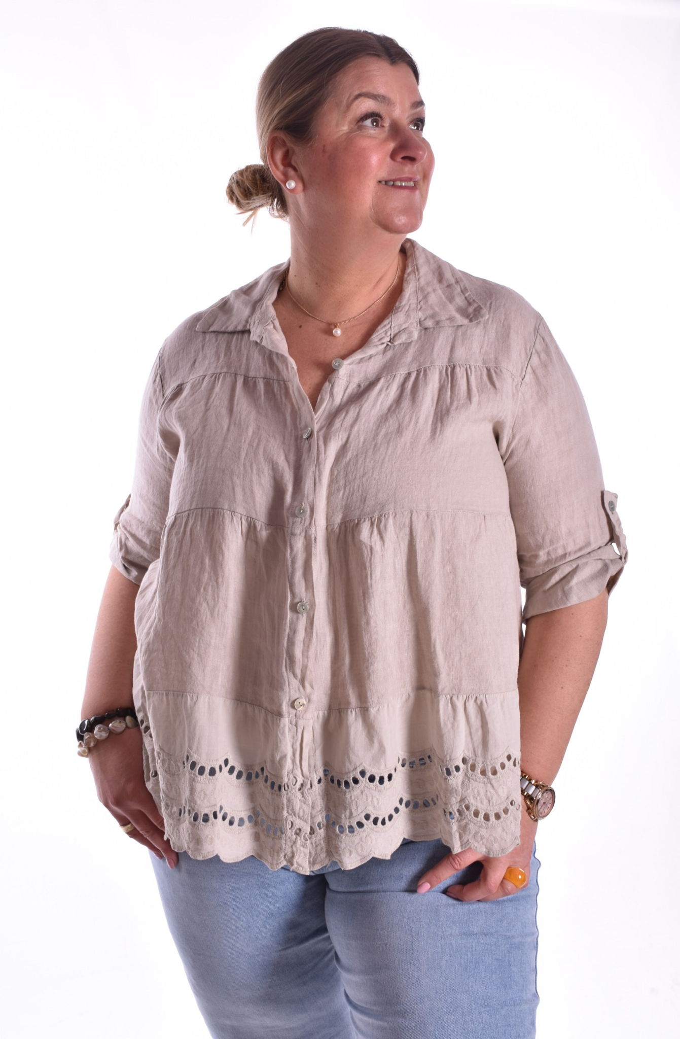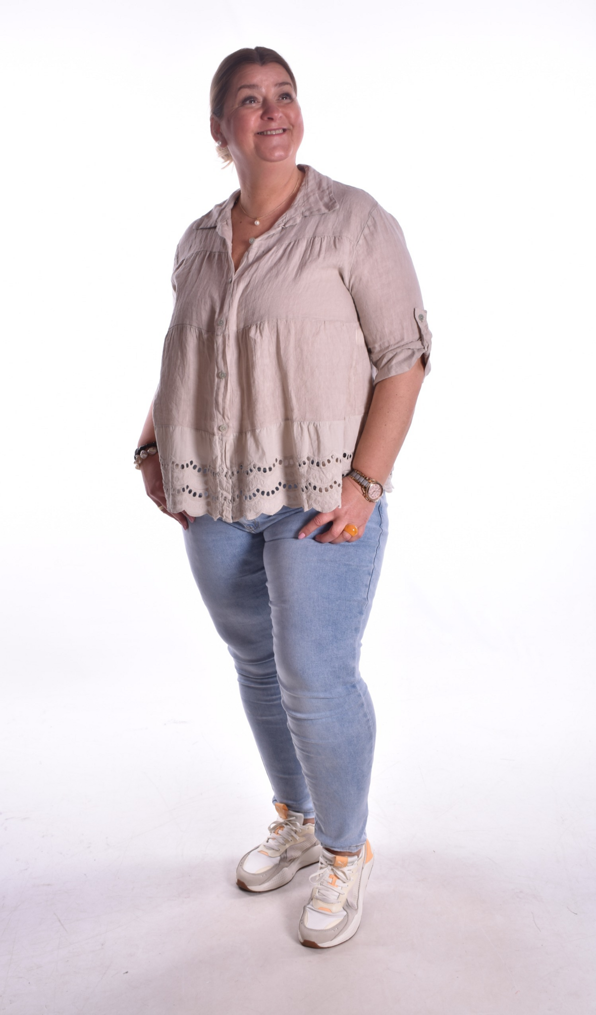 Blouse linnen is een doorgeknoopte linnen blouse met een kraagje. De blouse is een wijd uitlopend model.