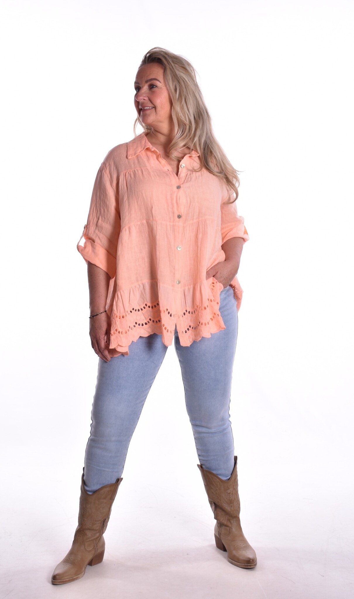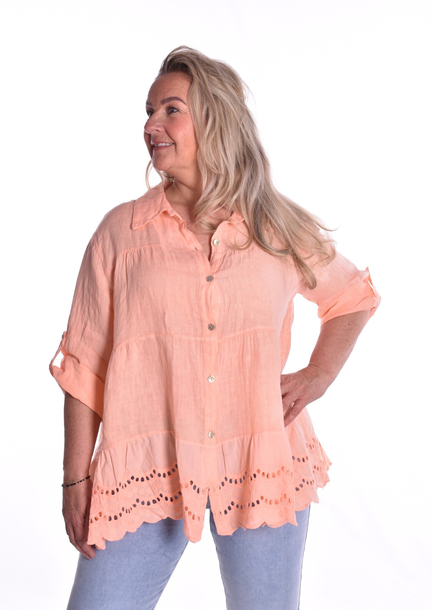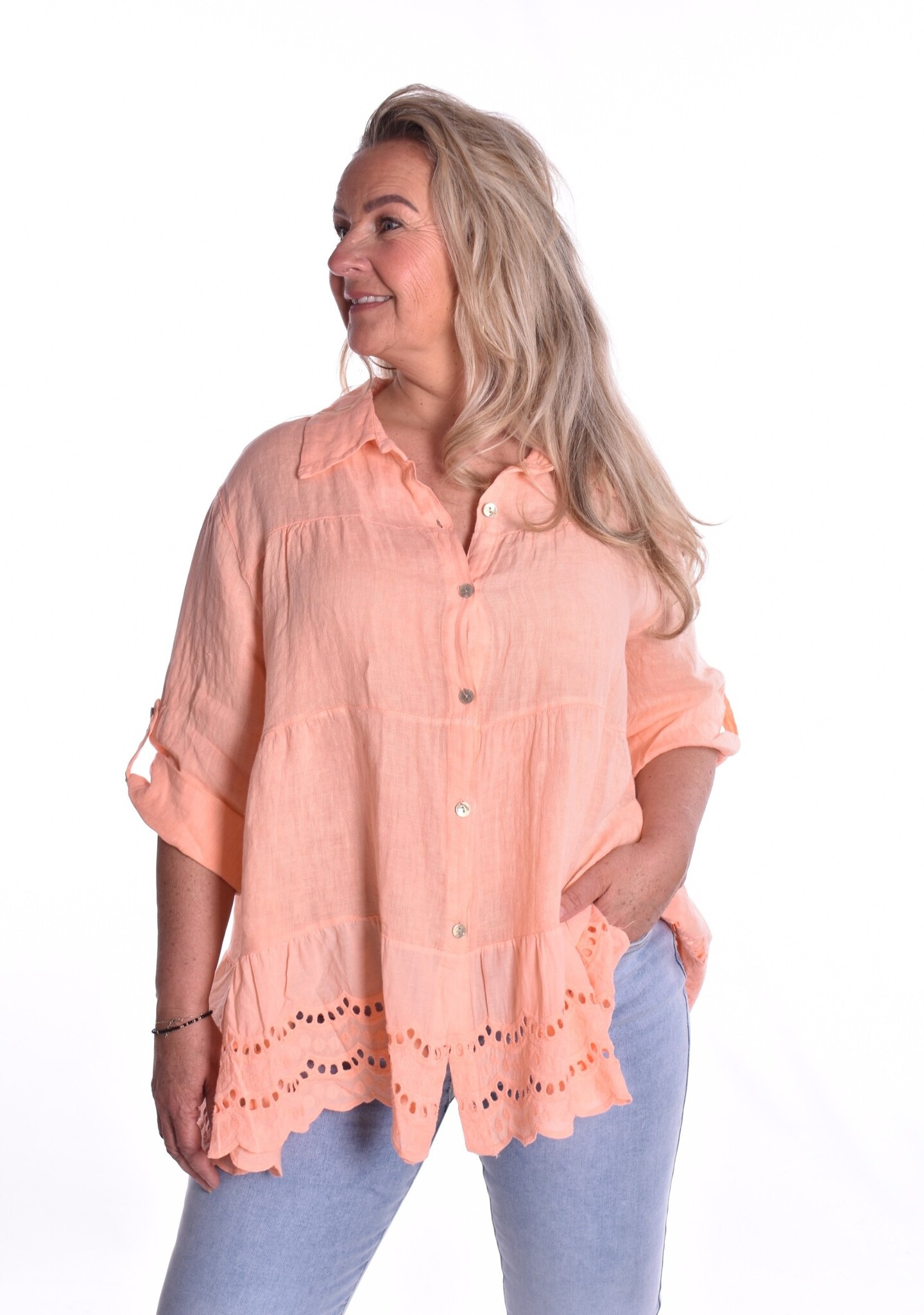 Blouse linnen is een doorgeknoopte linnen blouse met een kraagje. De blouse is een wijd uitlopend model.
