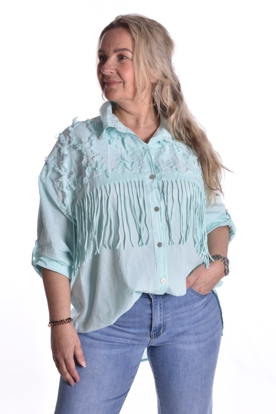Een katoenen, doorgeknoopte blouse. De blouse heeft leuke franjes!