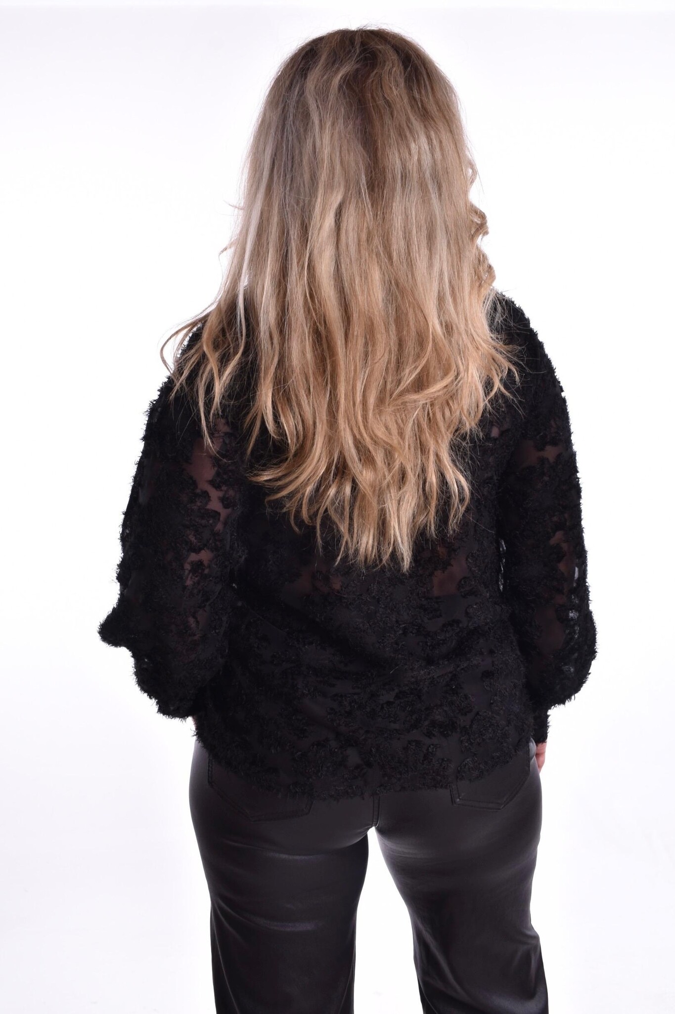 Fluffy kanten blouse met strik en manchetten met 2 knoopjes.