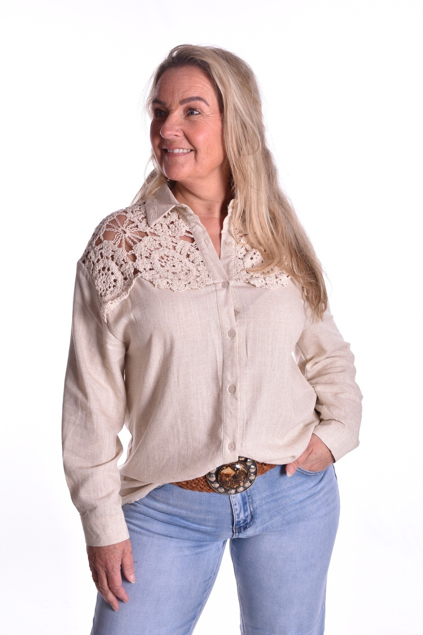 Blouse Sophia is een doorgeknoopte linnen/katoen blouse met een mooie gehaakte bovenkant.