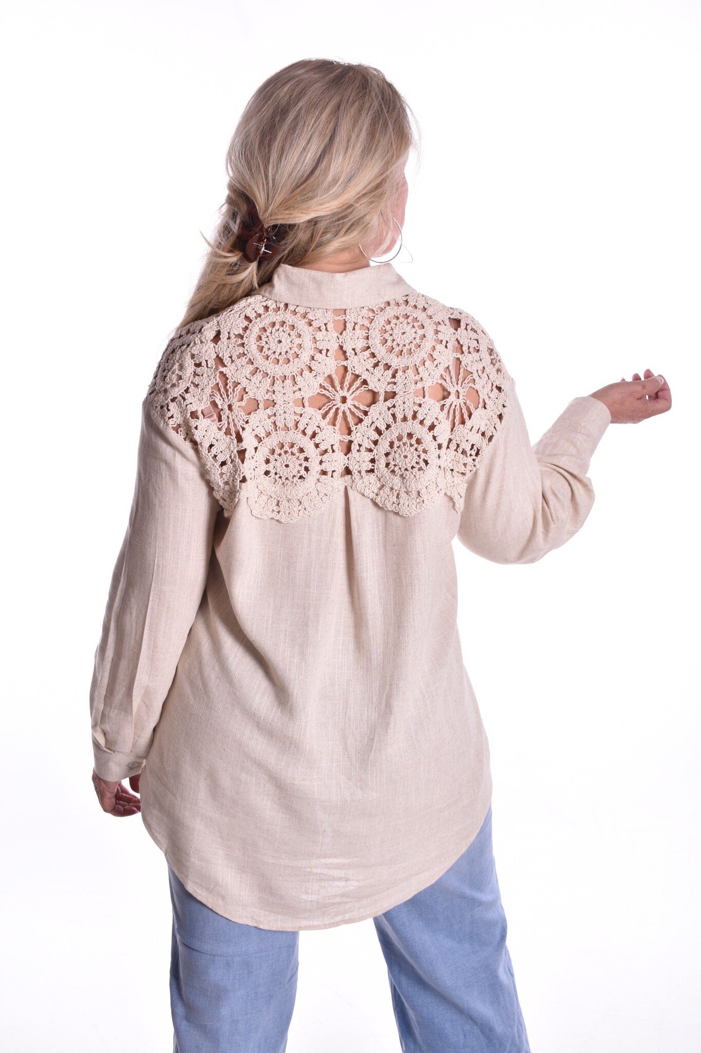 Blouse Sophia is een doorgeknoopte linnen/katoen blouse met een mooie gehaakte bovenkant.