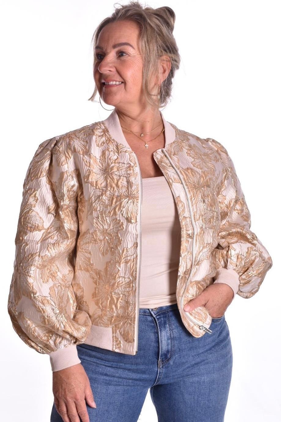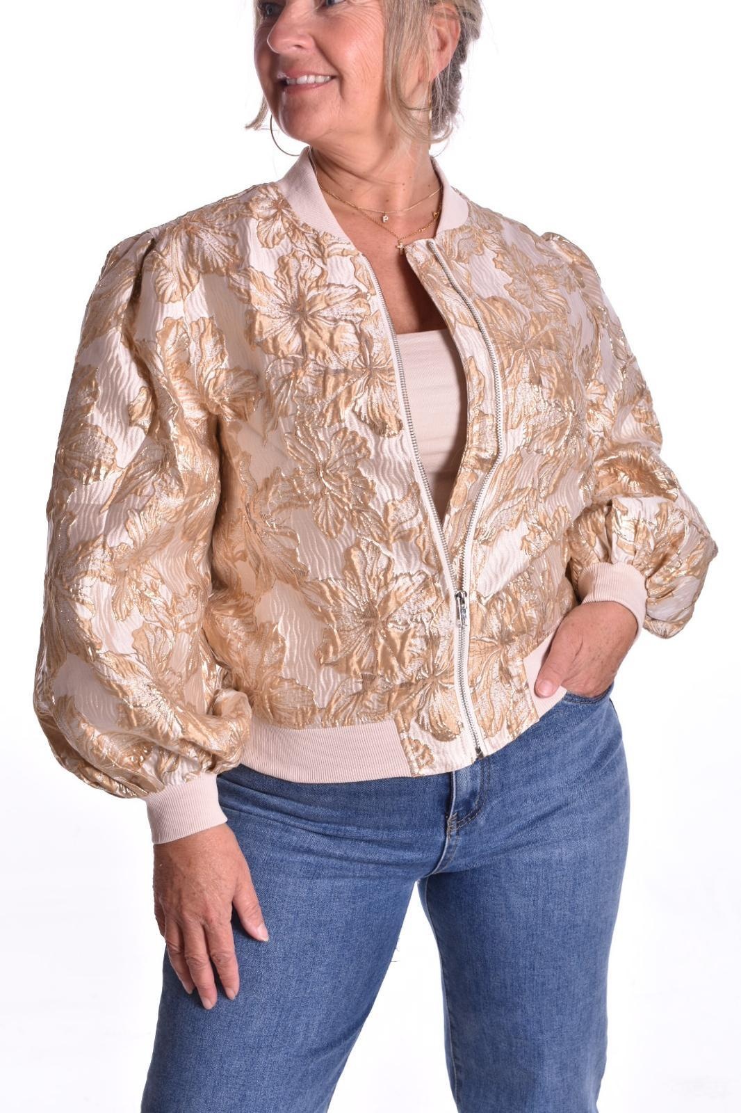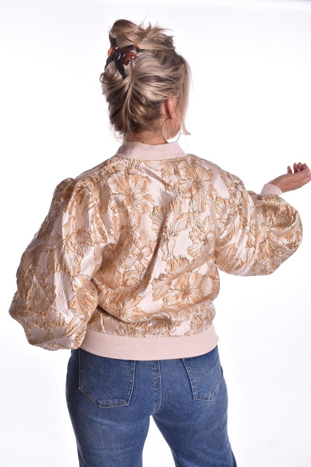 Bomber Lucy is een jasje met glans en gouden bloemen, met een ritssluiting.