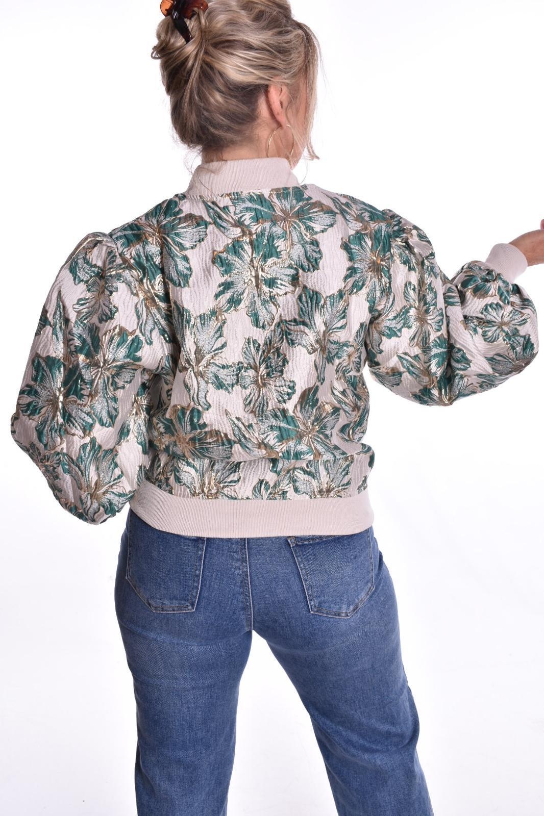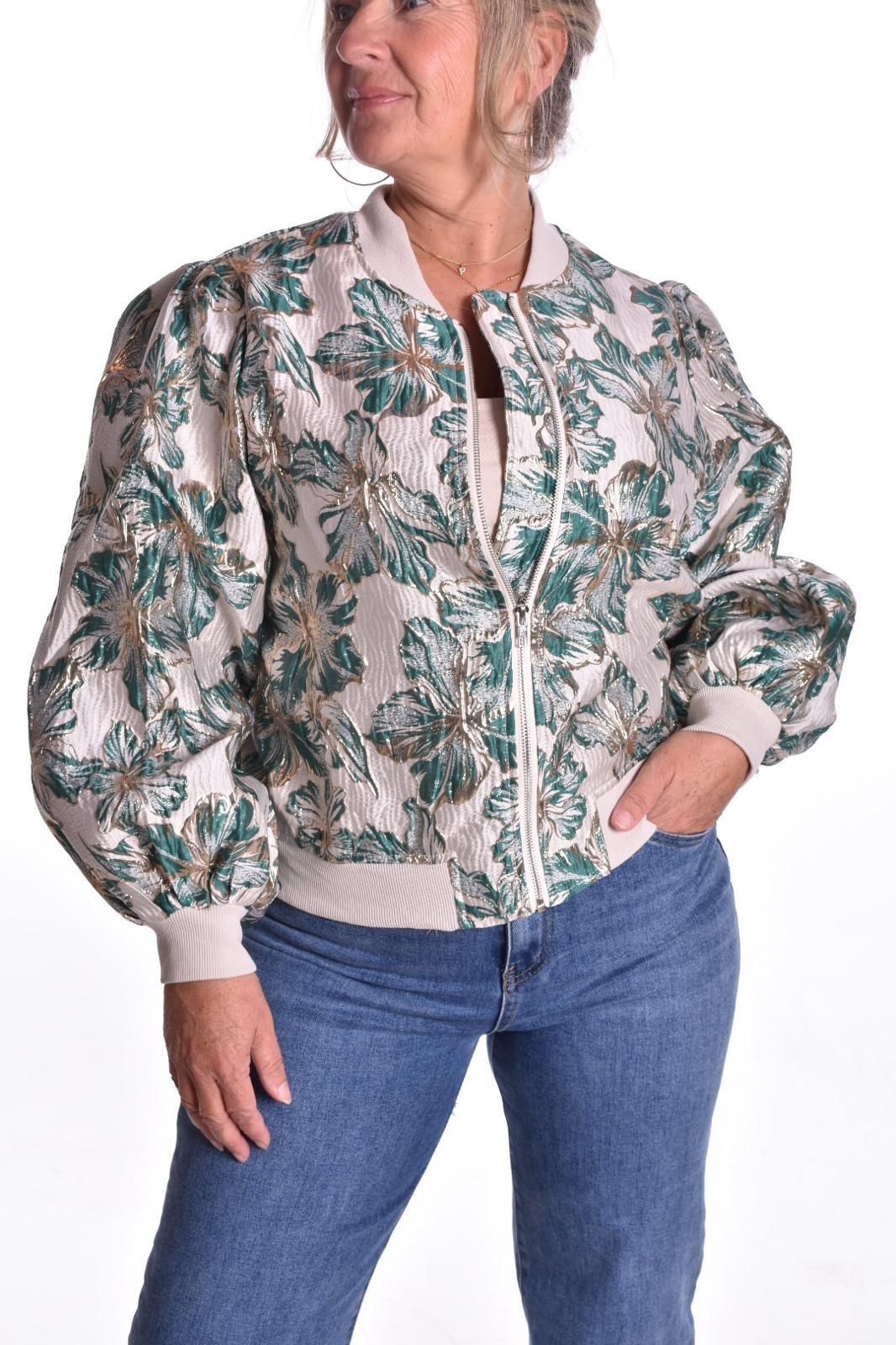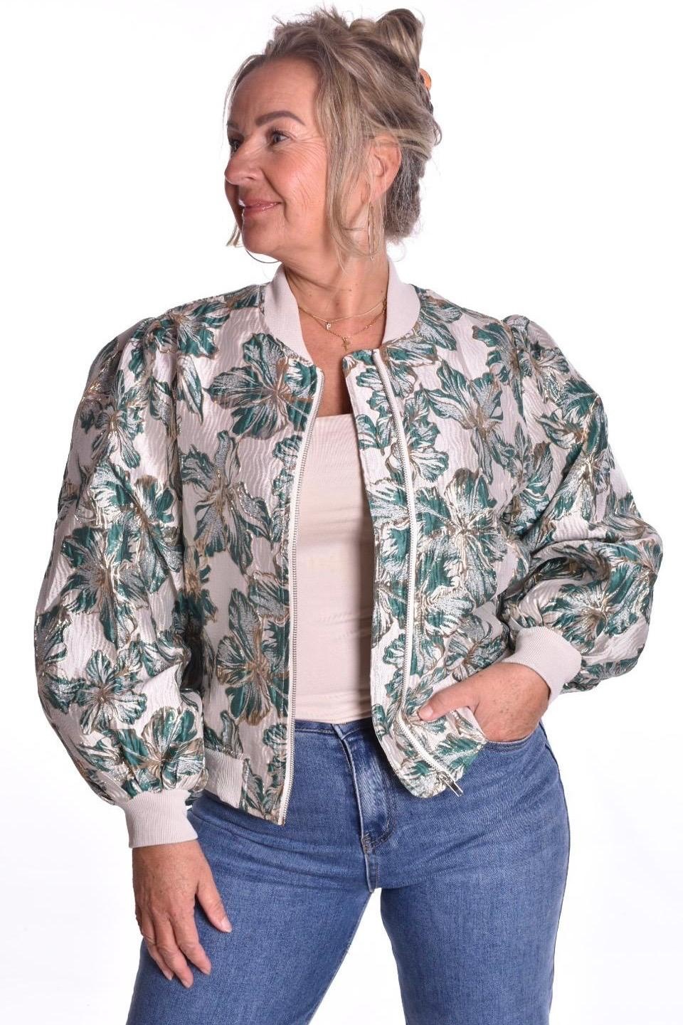 Bomber Lucy is een jasje met glans en gouden bloemen, met een ritssluiting.