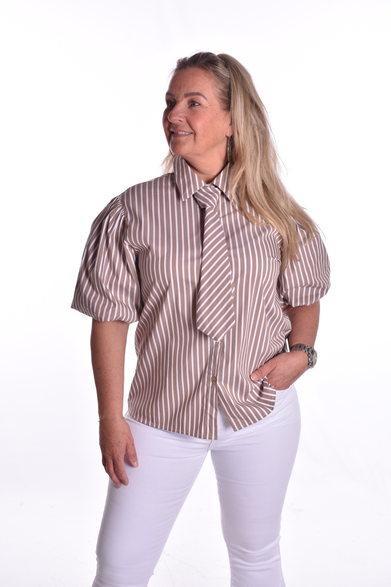 Leuke gestreepte overhemd blouse met pofmouwtjes en een stropdas.