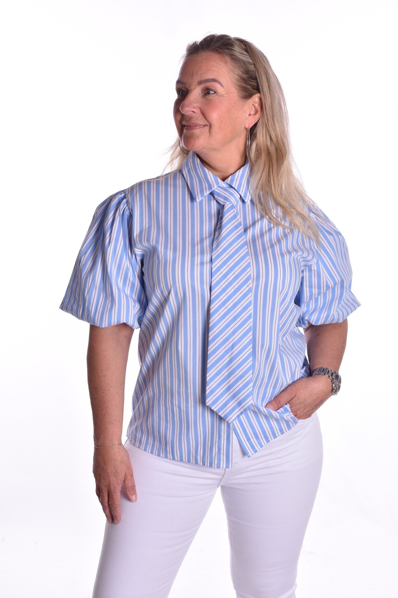 Leuke gestreepte overhemd blouse met pofmouwtjes en een stropdas.