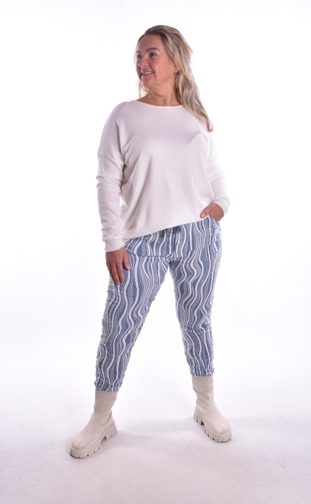 Een broek met veel stretch en een aanrijgkoord. De broek heeft twee steekzakken en zakken op de billen.