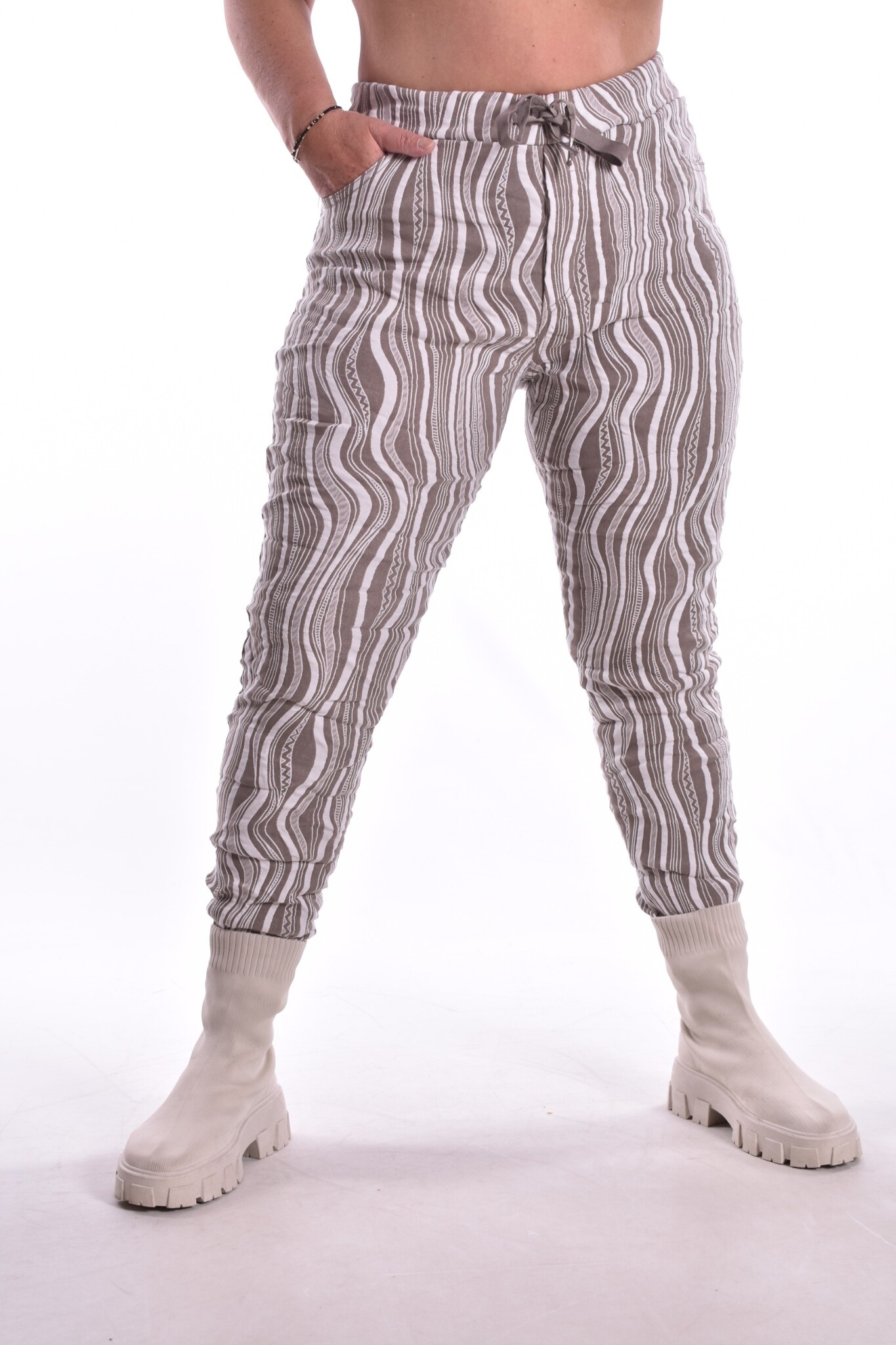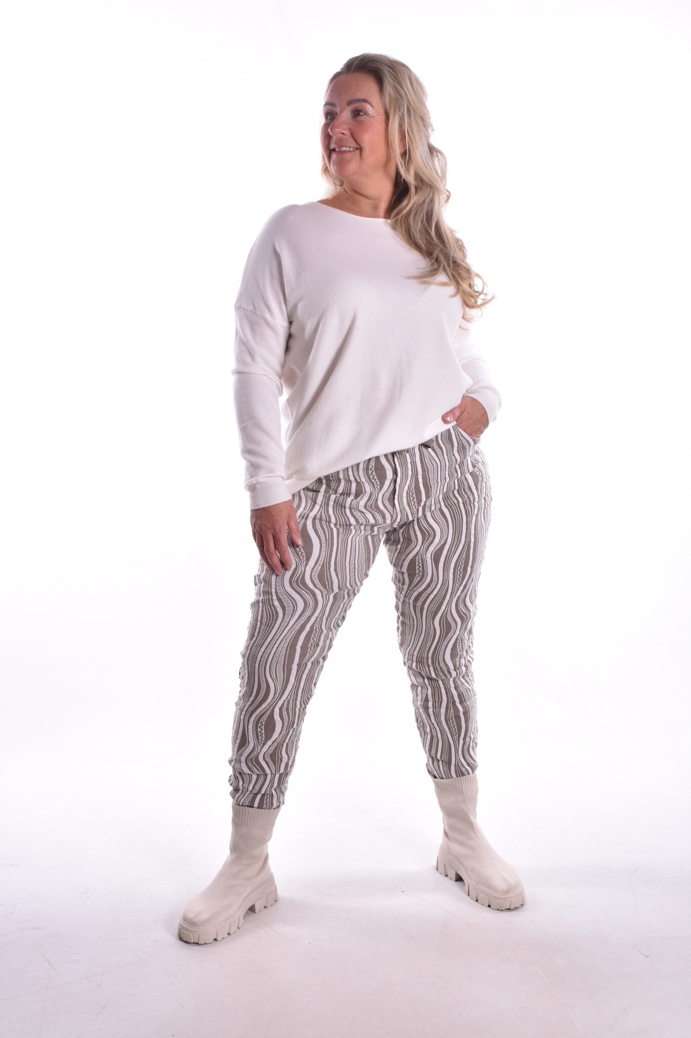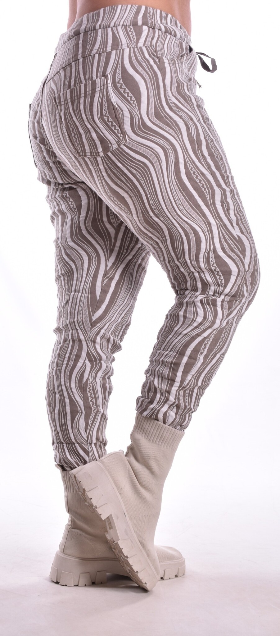 Een broek met veel stretch en een aanrijgkoord. De broek heeft twee steekzakken en zakken op de billen.