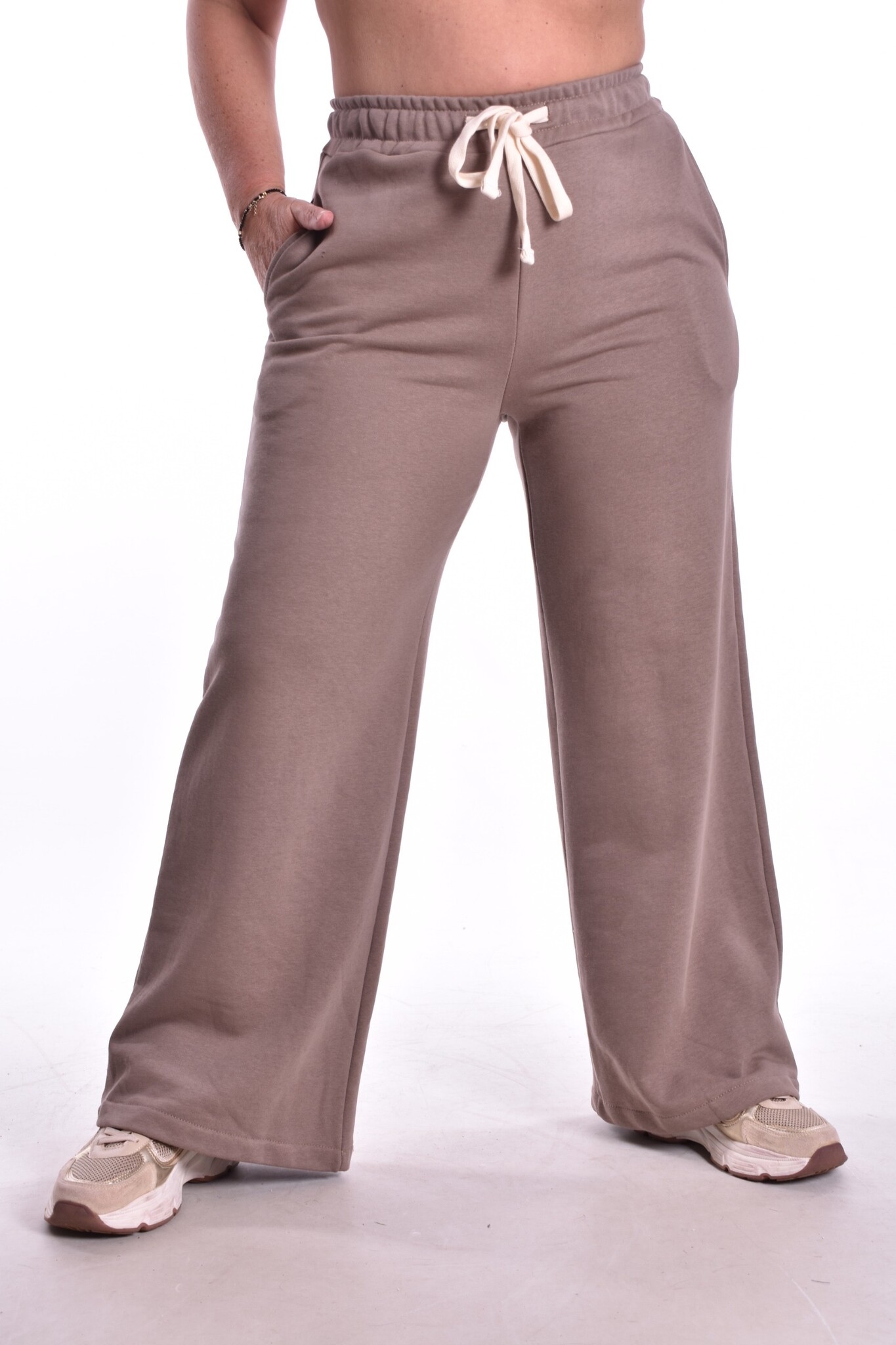 De broek La Dolce Vita van Mooij is een katoenen jogging broek met steekzakken, elastieken tailleband en aanrijgkoord. Het is een wide leg model met stretch. De broek is er in één maat en wij adviseren dat het gedragen kan worden t/m maat 42-44.