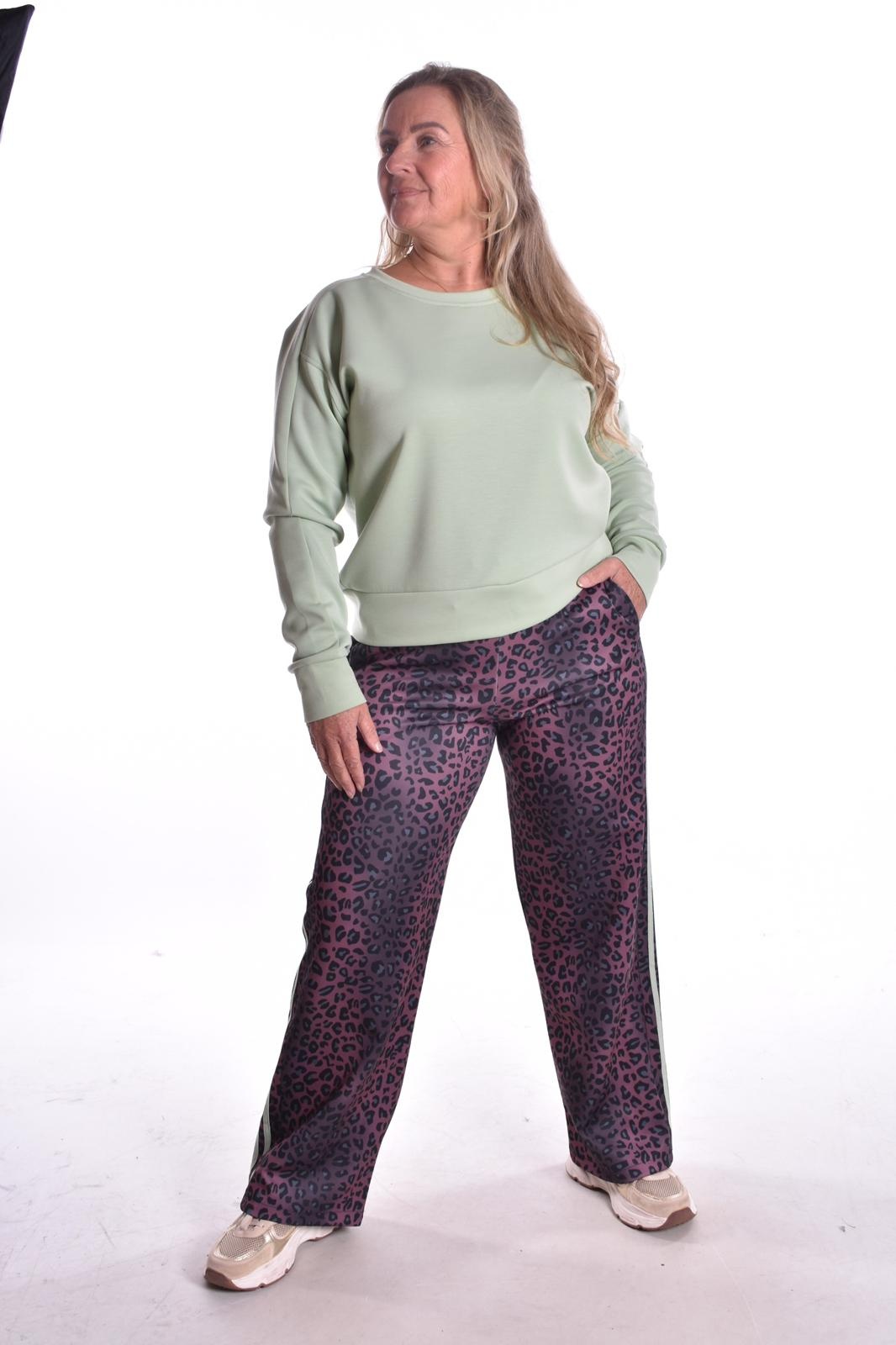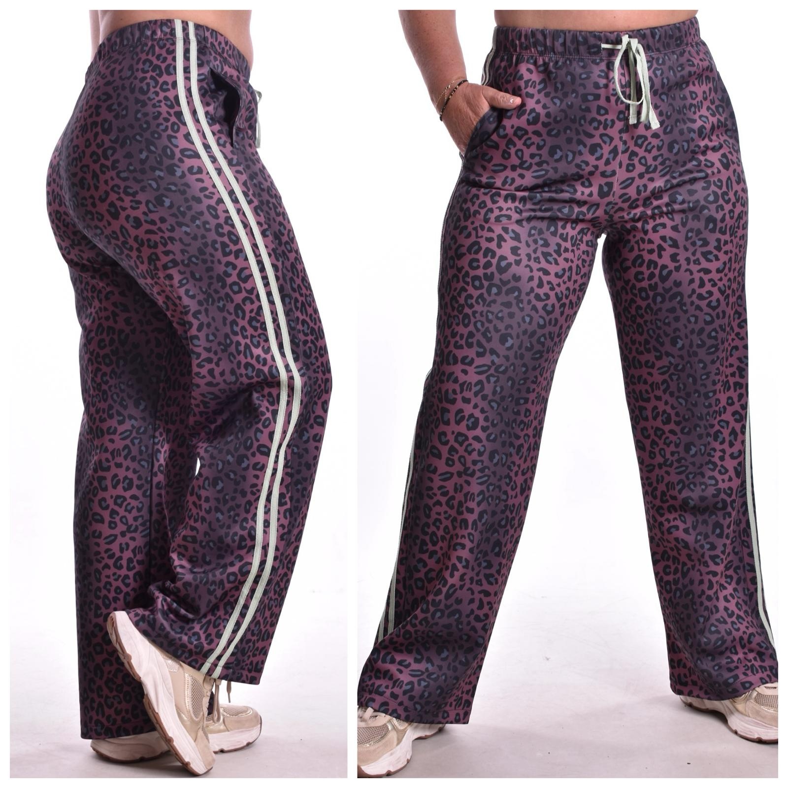 Broek Leo Lea is een super zachte, comfortabele broek met veel stretch in een panterprint. De broek heeft een taille band met een aanrijgkoord en steekzakken. Op de benen zijn gestikte biezen in zachte pastel kleuren die te combineren zijn met Top Lea.