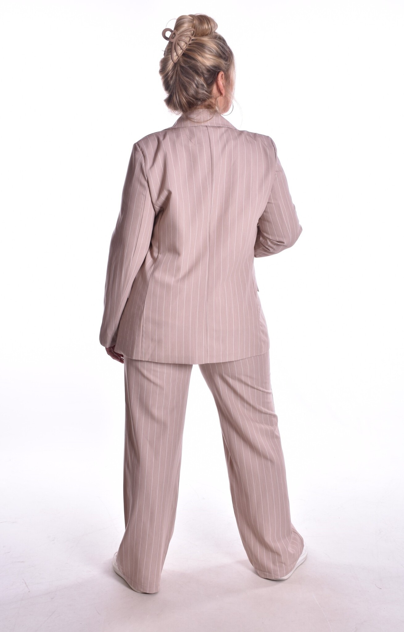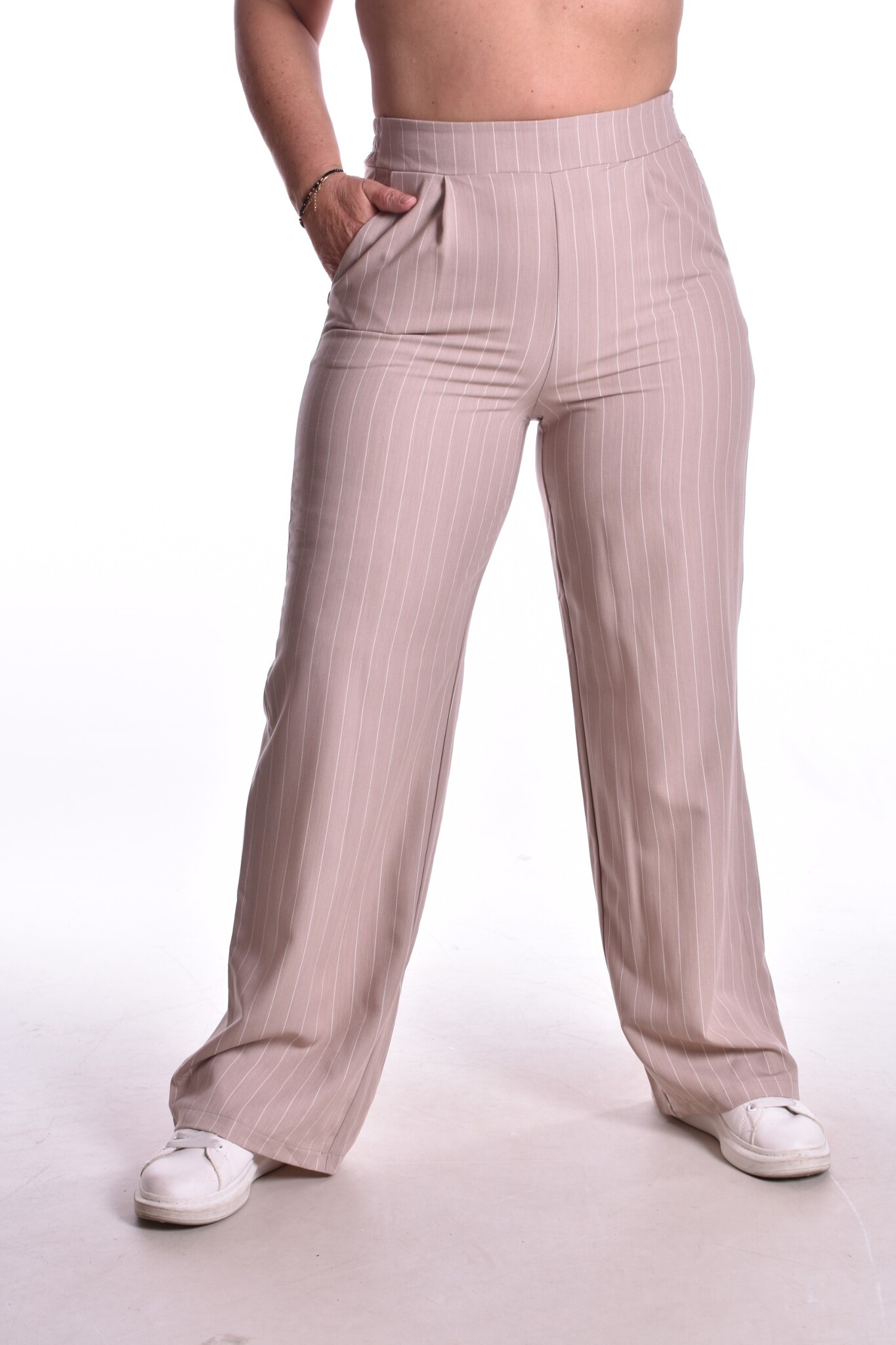 Broek Lina is een mooie pantalon broek met krijtstrepen en een ritsluiting aan de zijkant. De broek heeft twee steekzakken en elastiek aan de achterkant van de tailleband. De broek valt vrij lang.