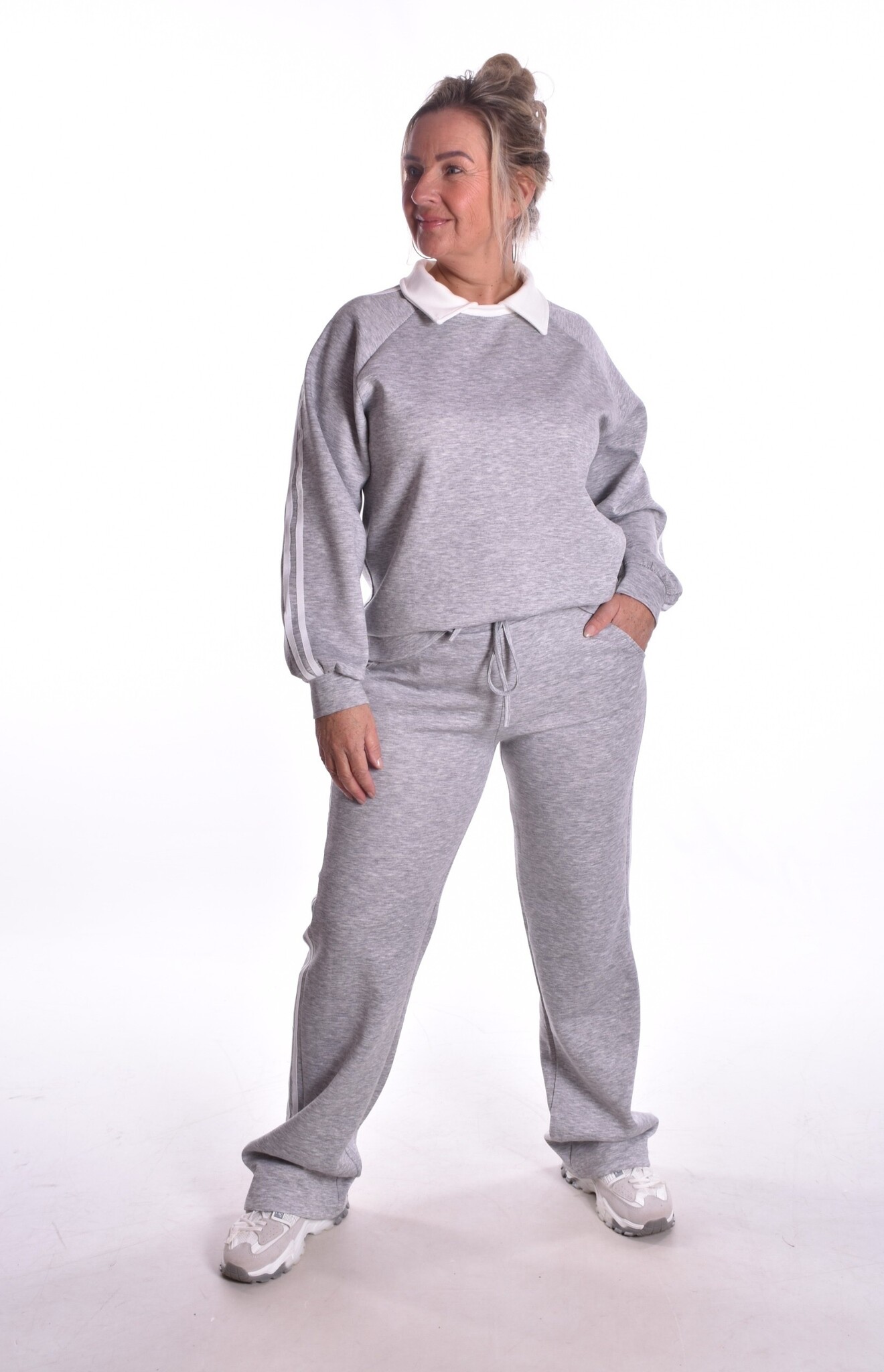 De broek Lotte heeft een elastieken band met aanrijgkoord, steekzakken en gekleurde biezen aan de zijkant.