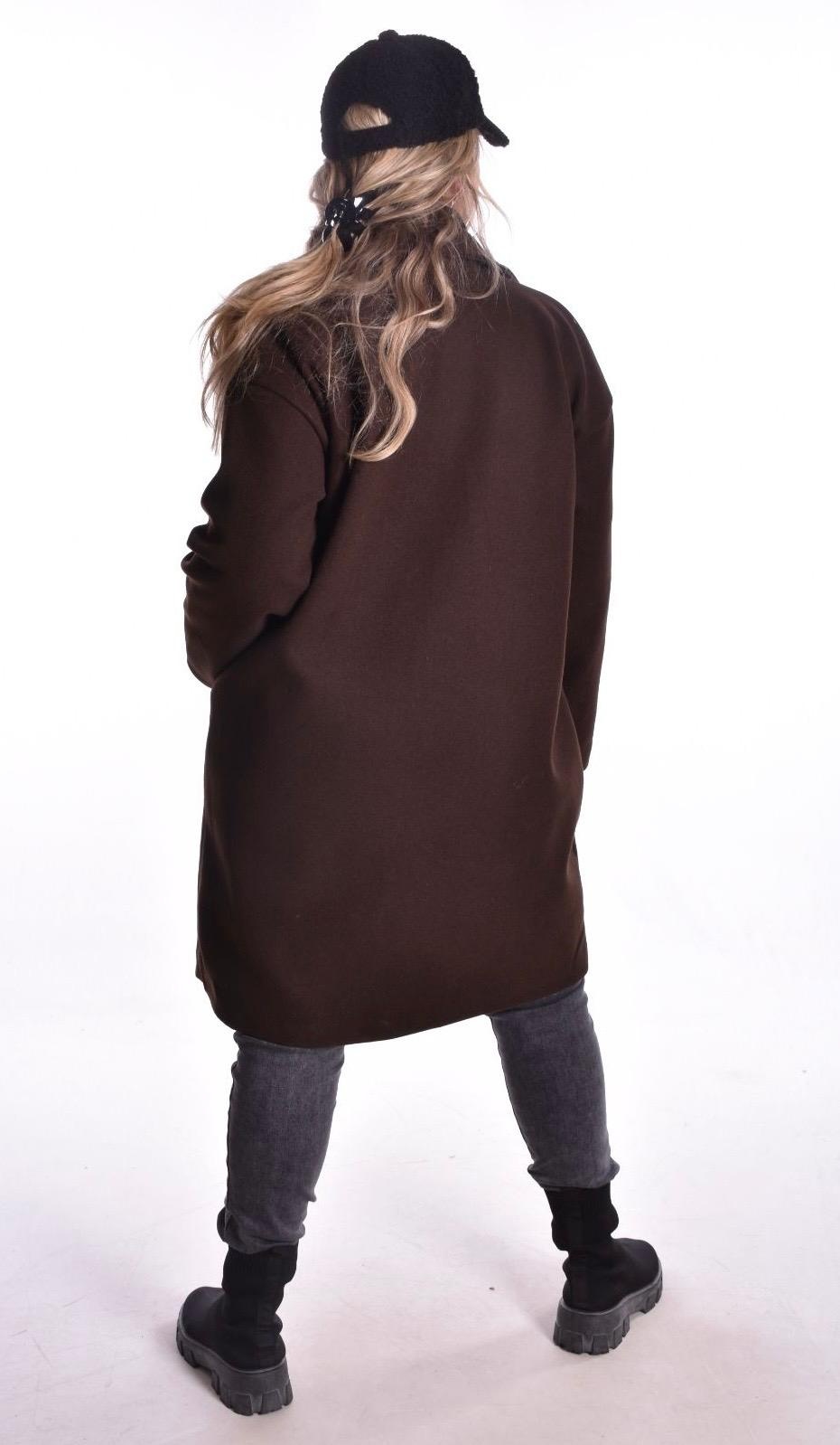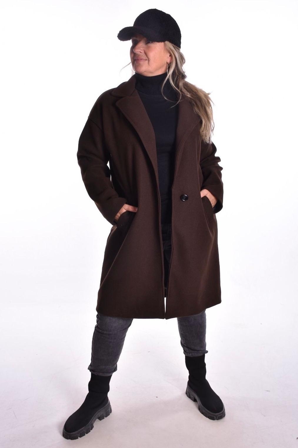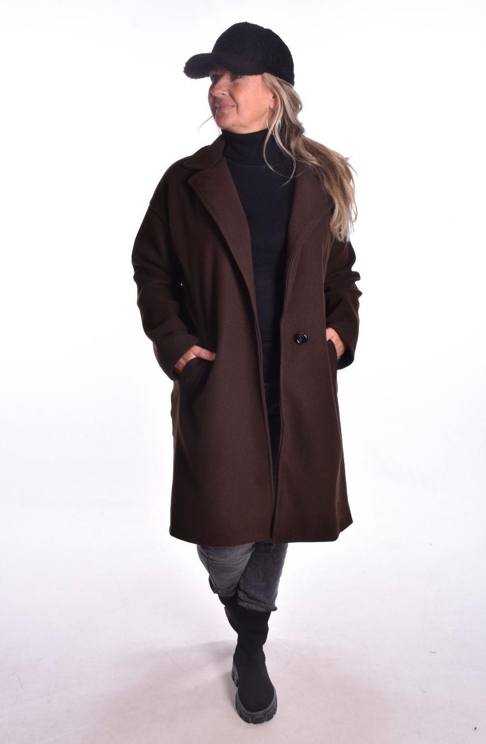Jas Gina is een ruimvallende gevoerde jas met knoopsluiting en steekzakken.