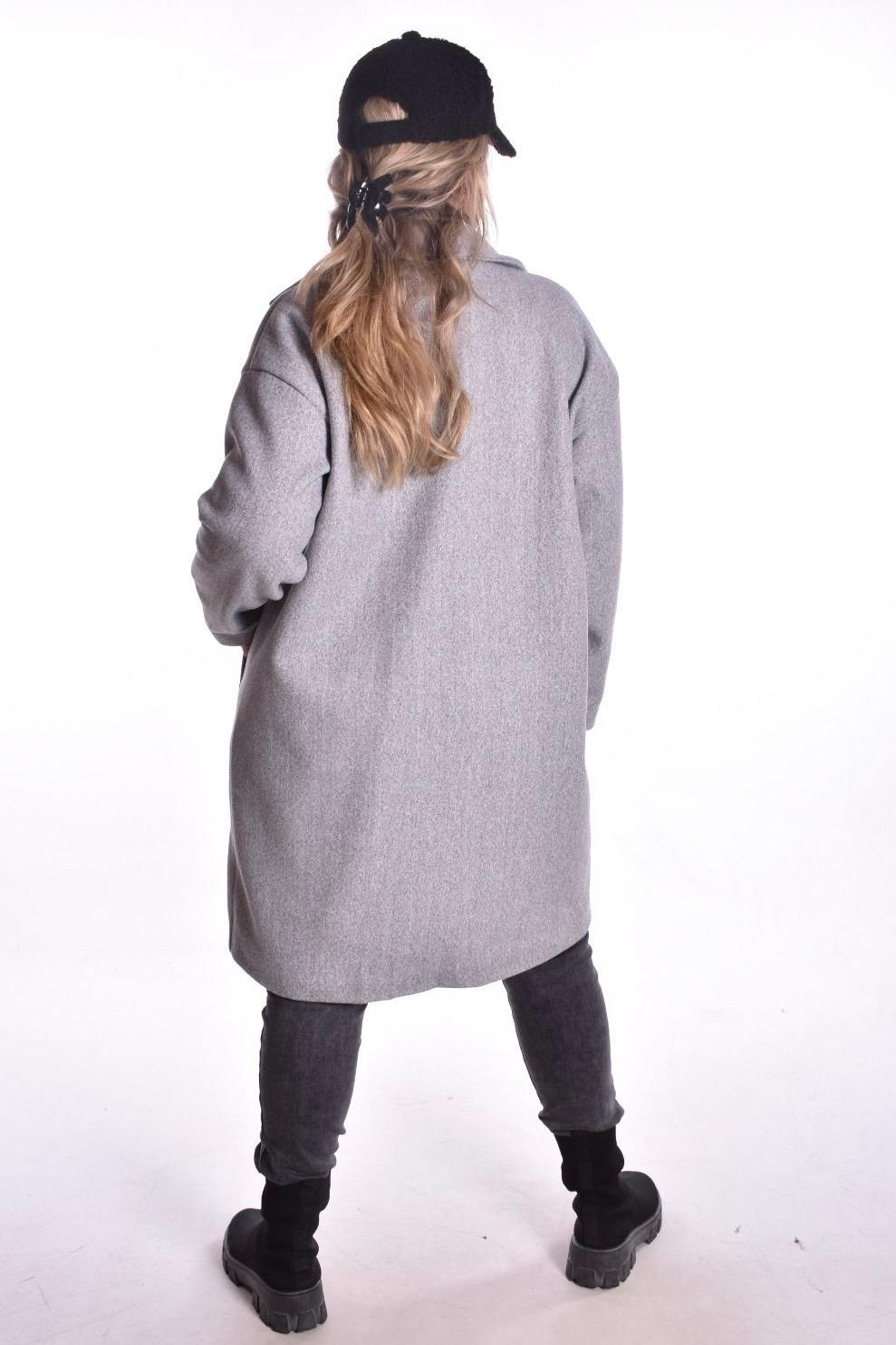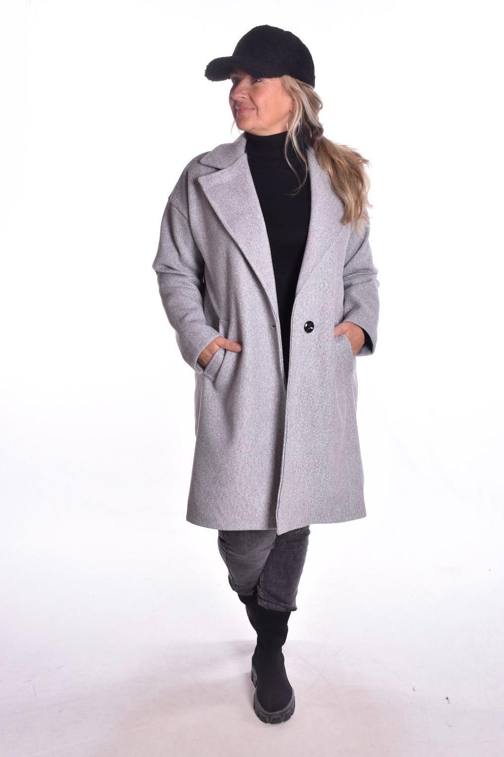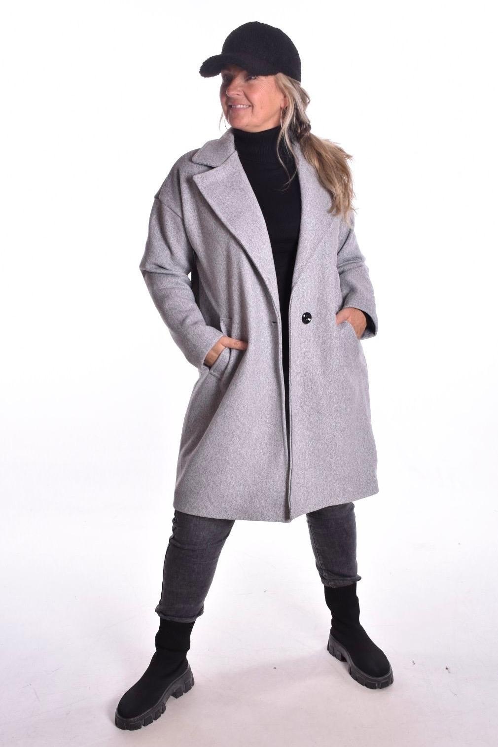Jas Gina is een ruimvallende gevoerde jas met knoopsluiting en steekzakken.
