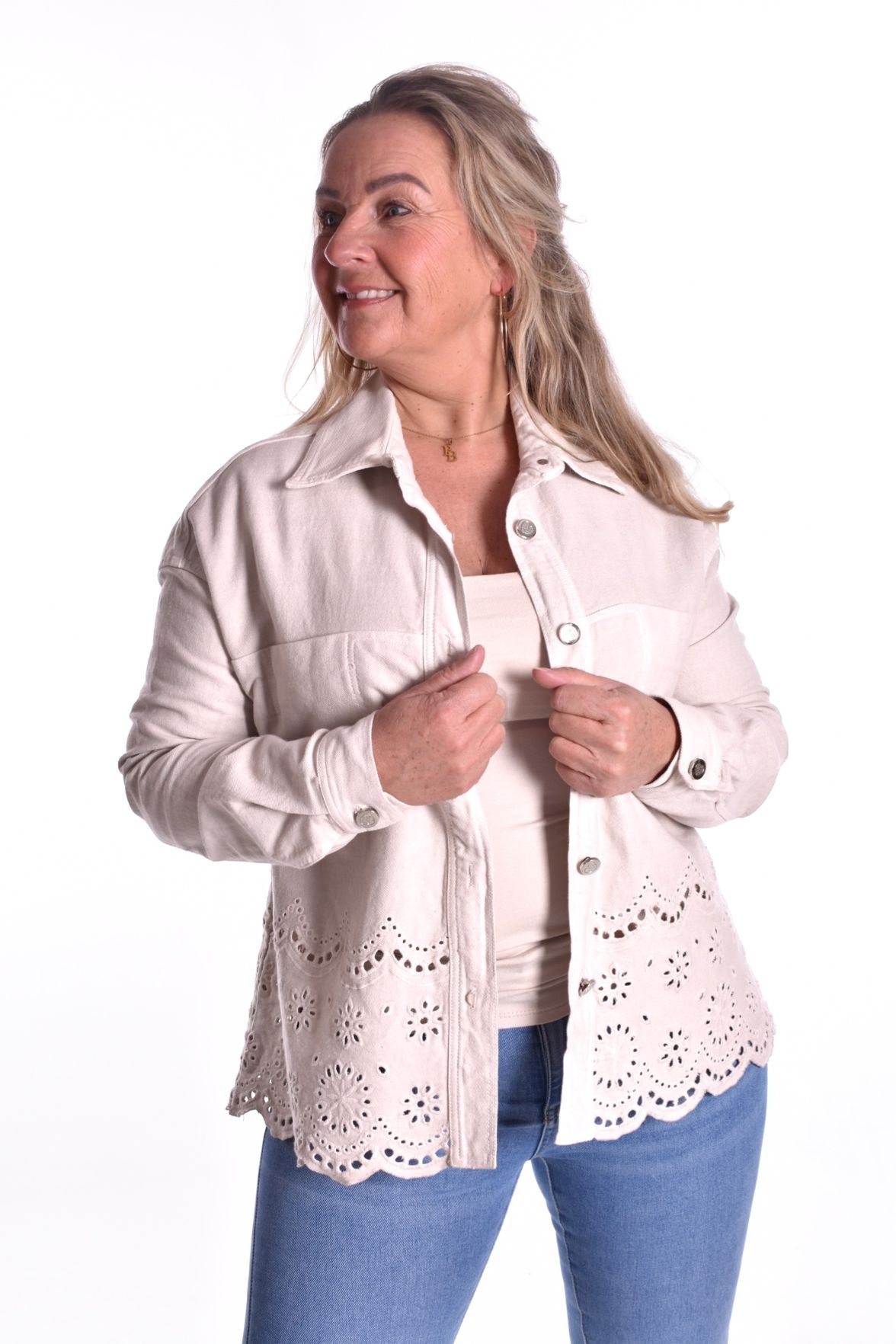 Jasje Lies is een doorgeknoopt jasje van een spijkerstofje met twee borstzakken en broderie aan de onderkant. Het jasje is er in één maat en wij adviseren dat het te dragen is t/m een maat 42. Ons model heeft maat 40 en is 165 cm lang. Ook als blouse te dragen!