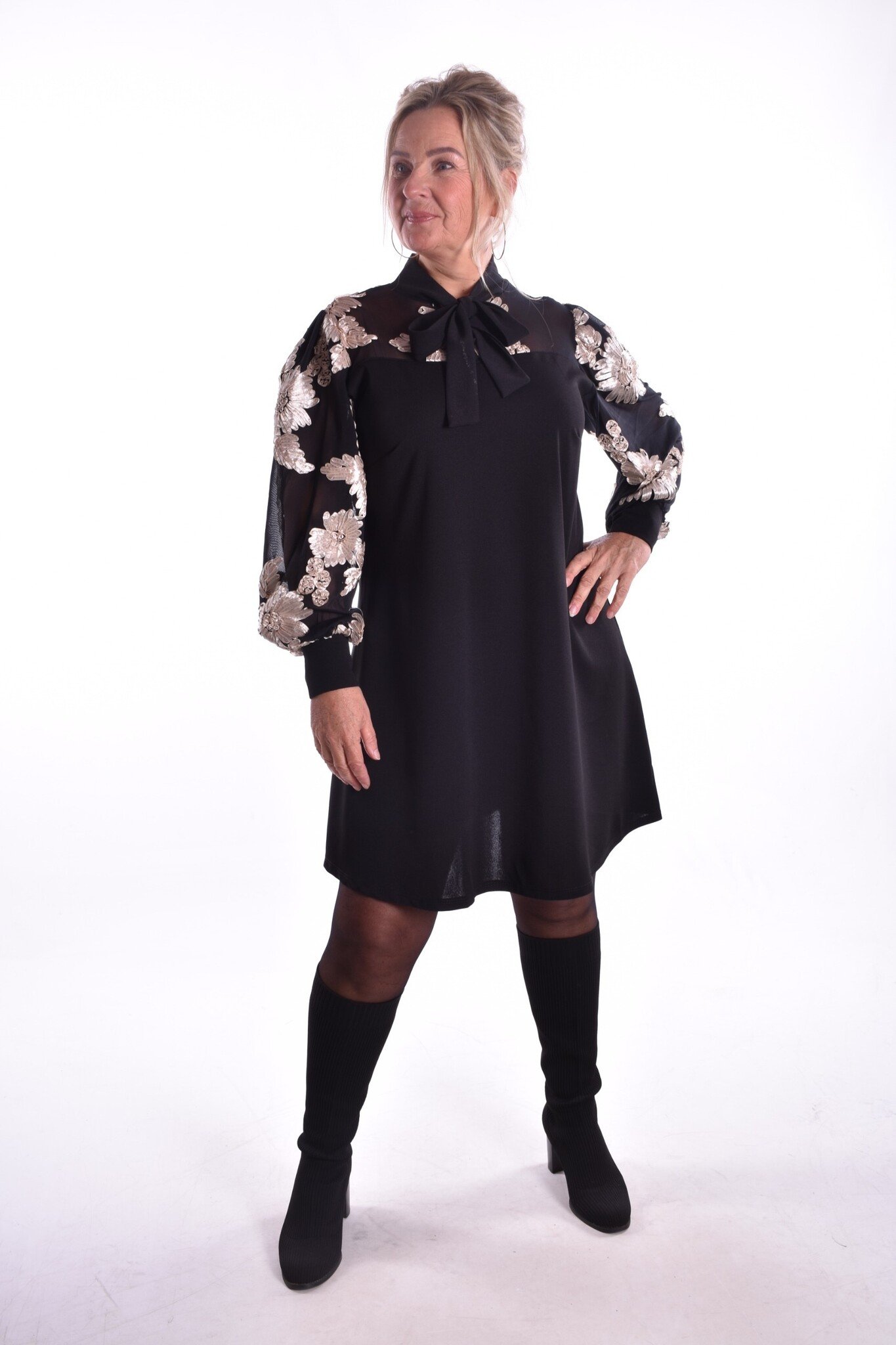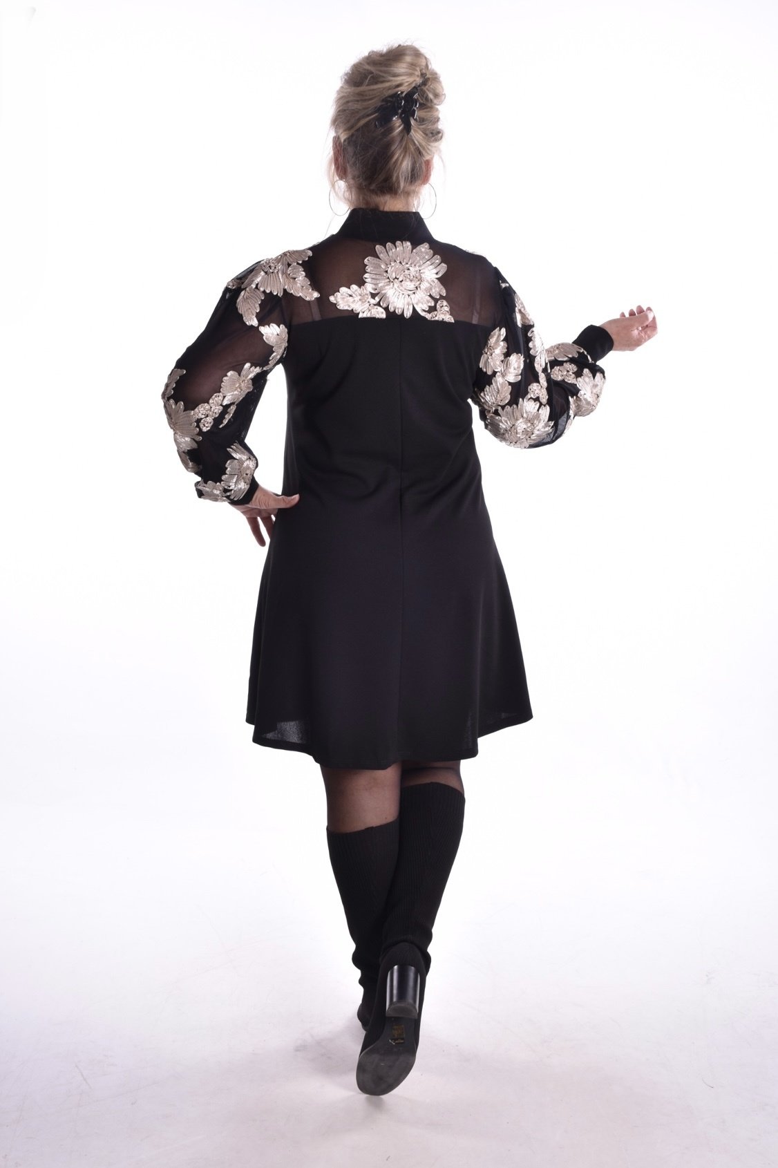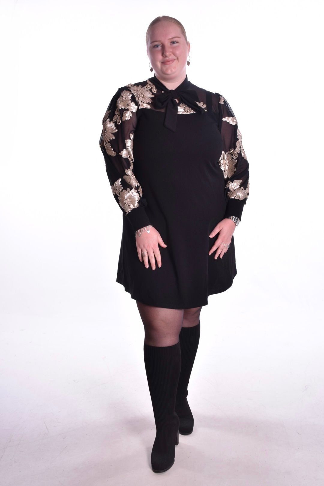 Een jurk met een prachtige A-lijn, sierlijke bloemen, en elegante voile mouwen. De schouders zijn gemaakt van stretch, en de hele jurk is uitgevoerd in een soepel, elastisch stofje.