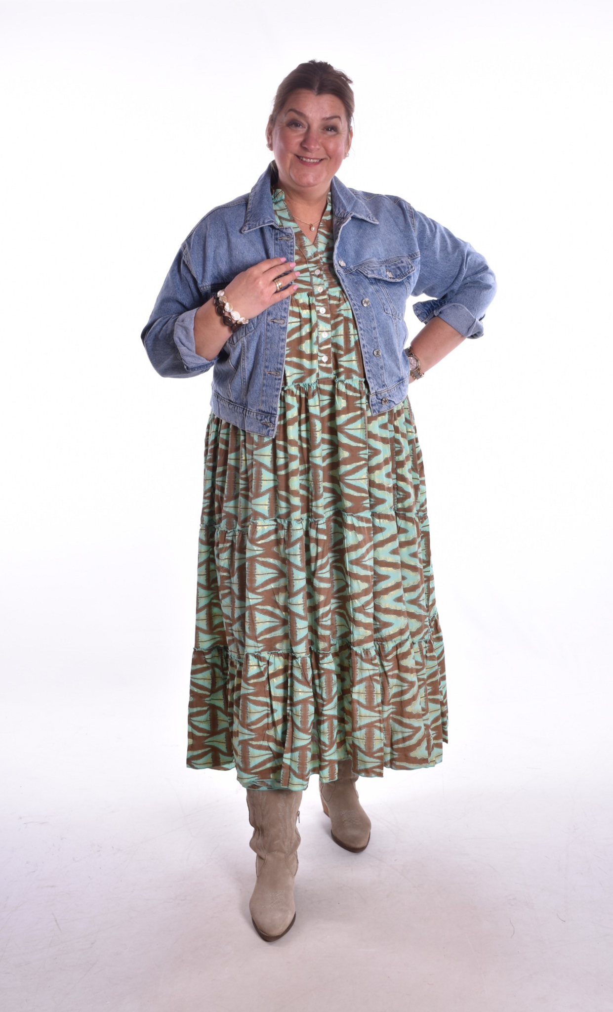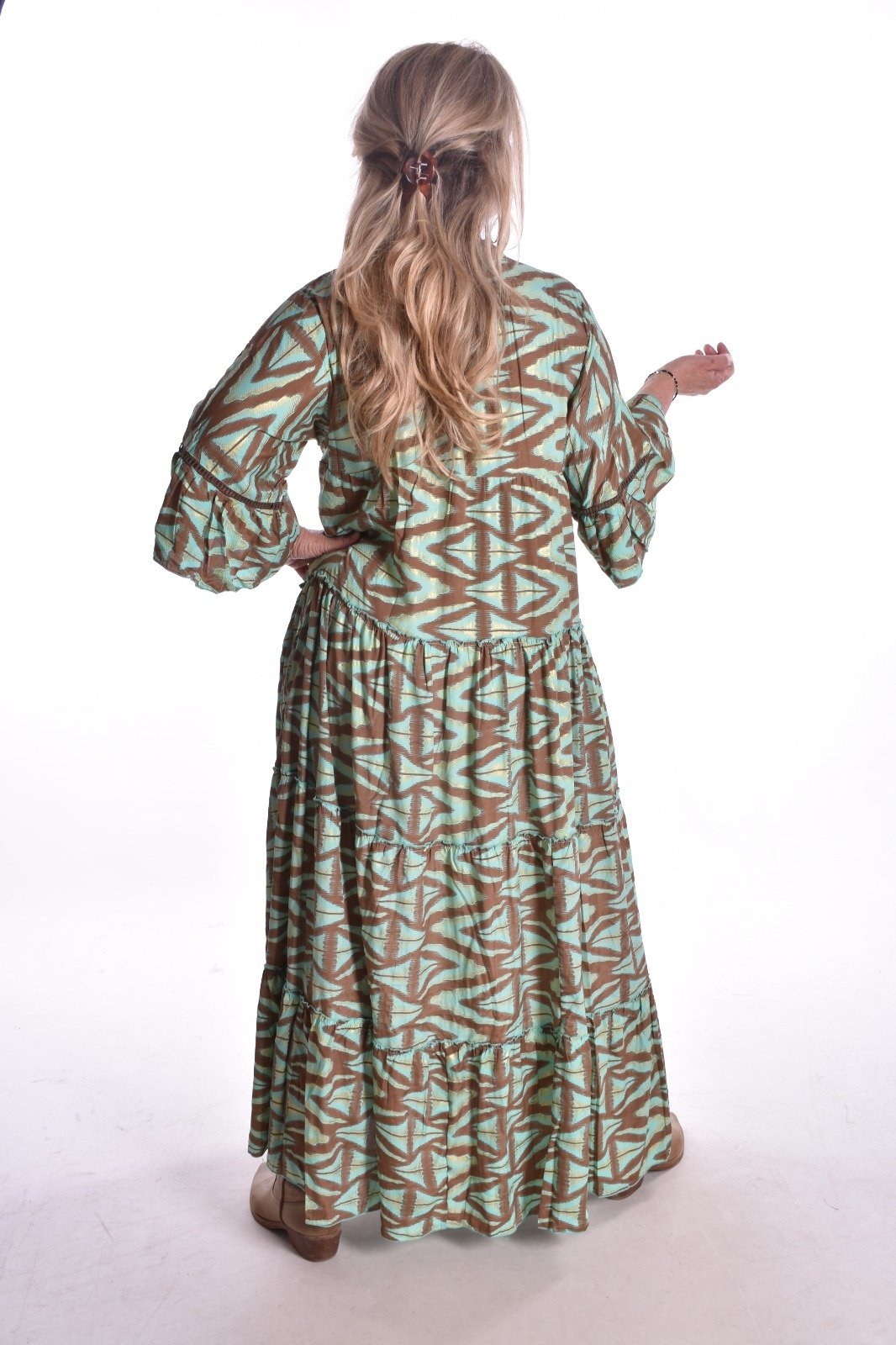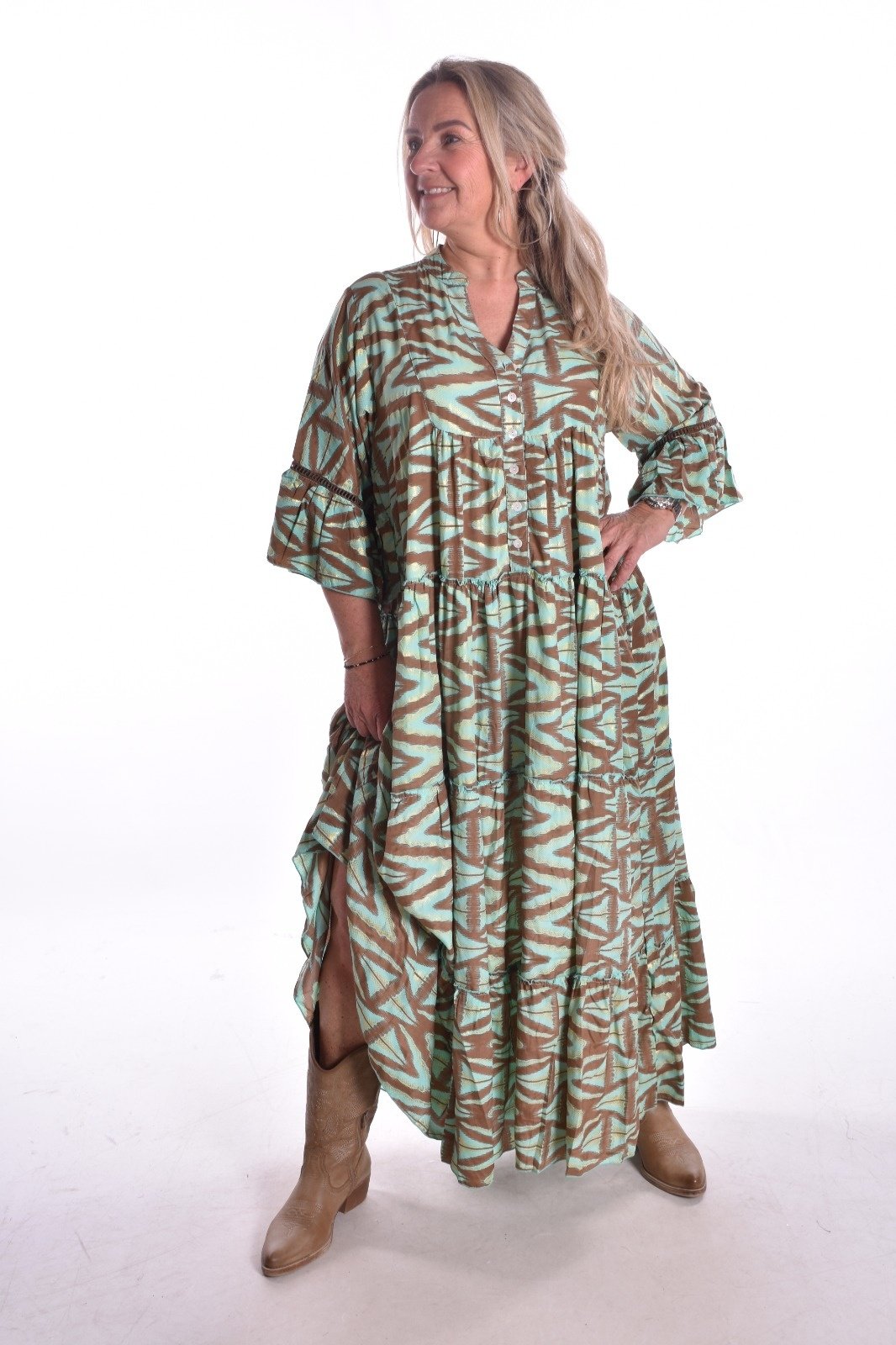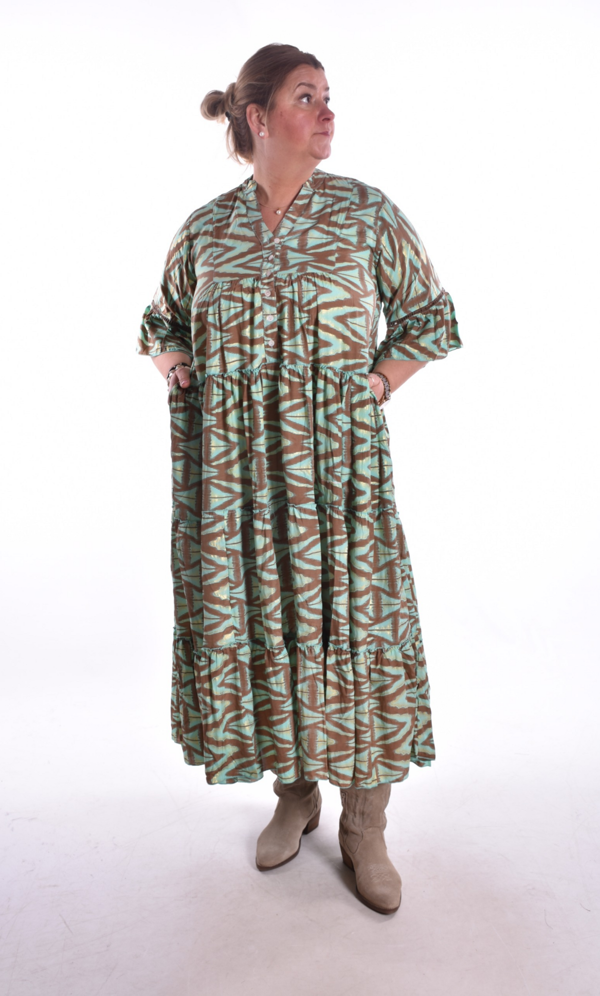 Prachtige kwaliteit met 70% zijden. De jurk is een ruimvallend model met stroken.