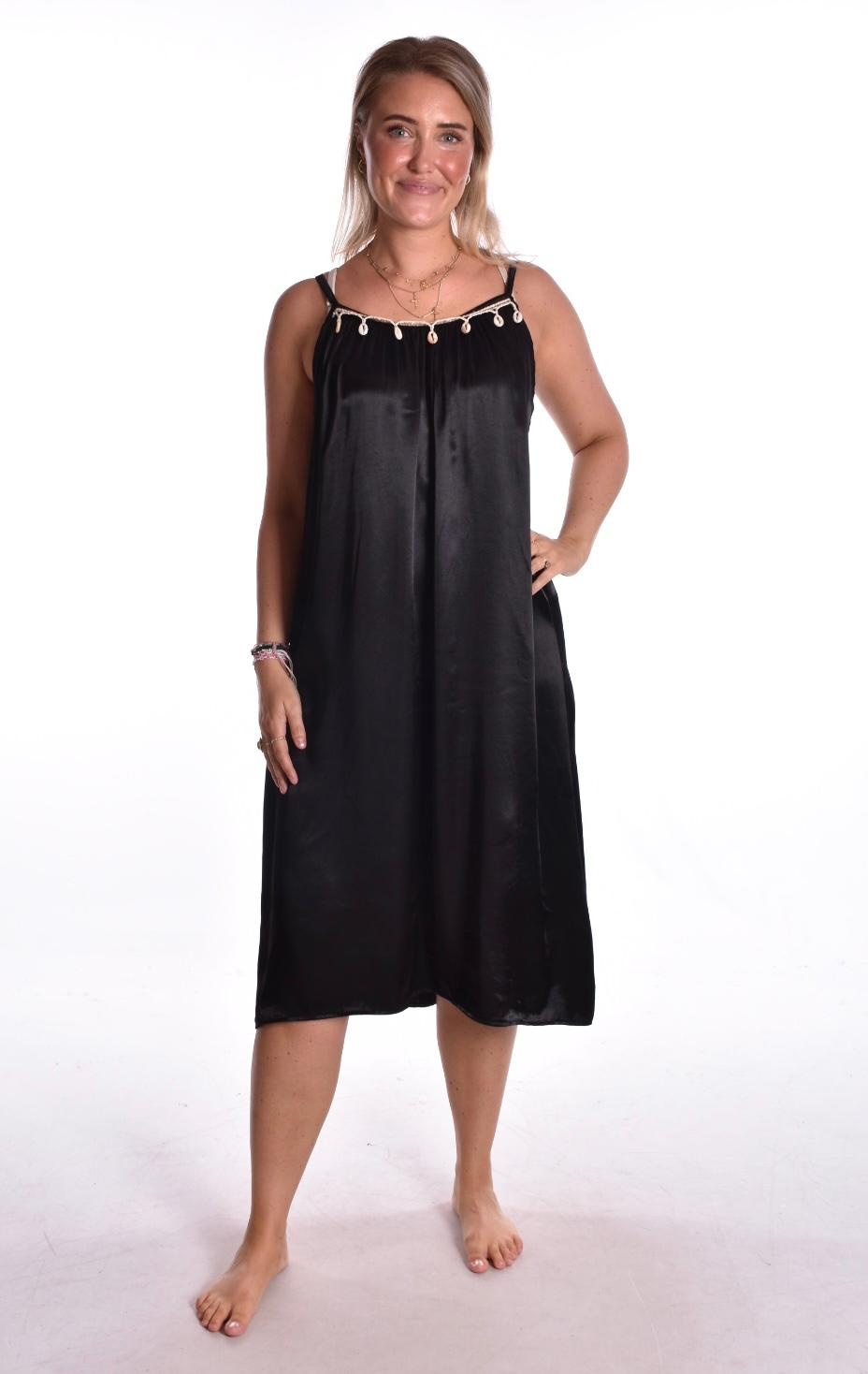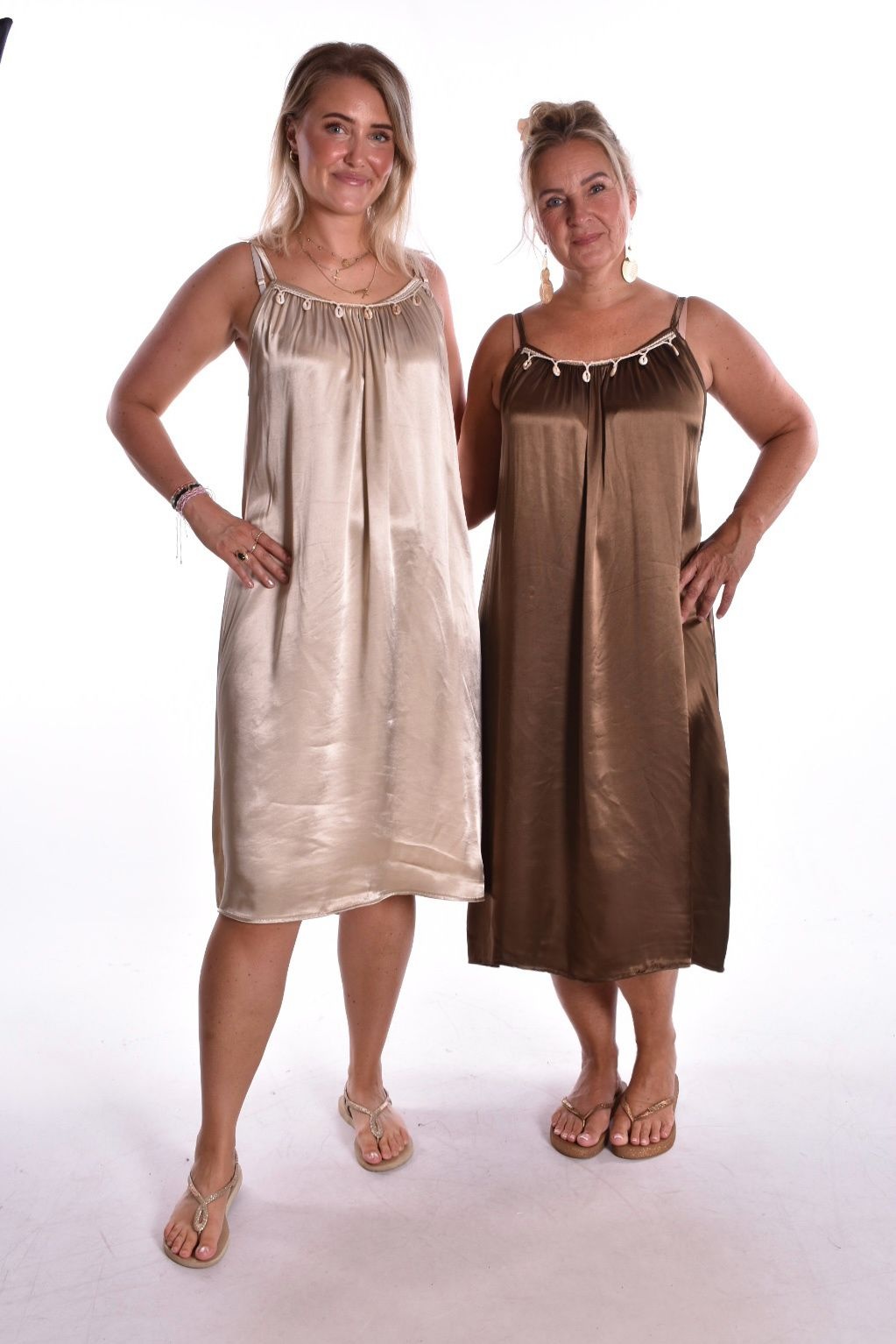 Prachtige jurk met echte schelpjes als detail, de jurk is gemaakt van een satijn achtige stof.