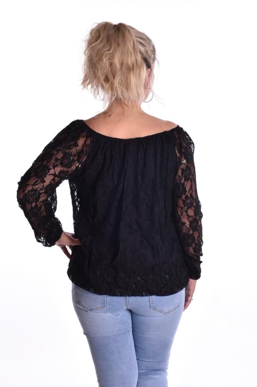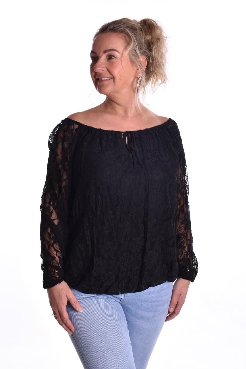 Kanten top Mia is een ballontop met een zachte viscose stretch voering. Er zit ook elastiek bij de hals waardoor het ook off-shoulder gedragen kan worden. En bij de hals zit ook een strikje die je ook open kunt laten.