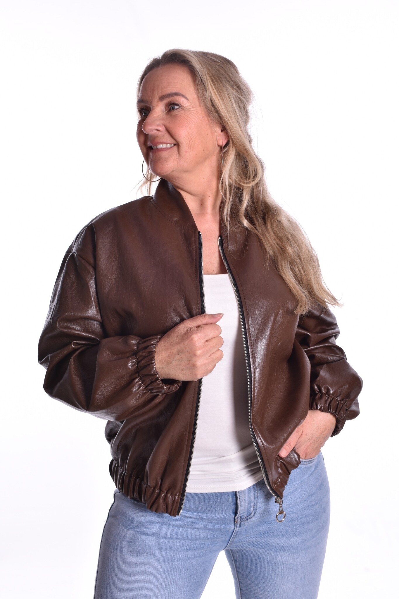 Bomber jasje met ritssluiting van leatherlook met steekzakken.