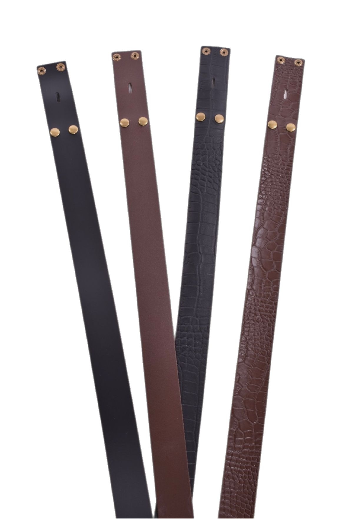 Leren ceintuur zonder gesp, maar deze buckels zijn los te bestellen en kun je mixen en matchen door middel van drukkers. Zo kun je bij beide gespen kiezen welk ceintuur je wilt. Zo kun je ze ook afwisselen.