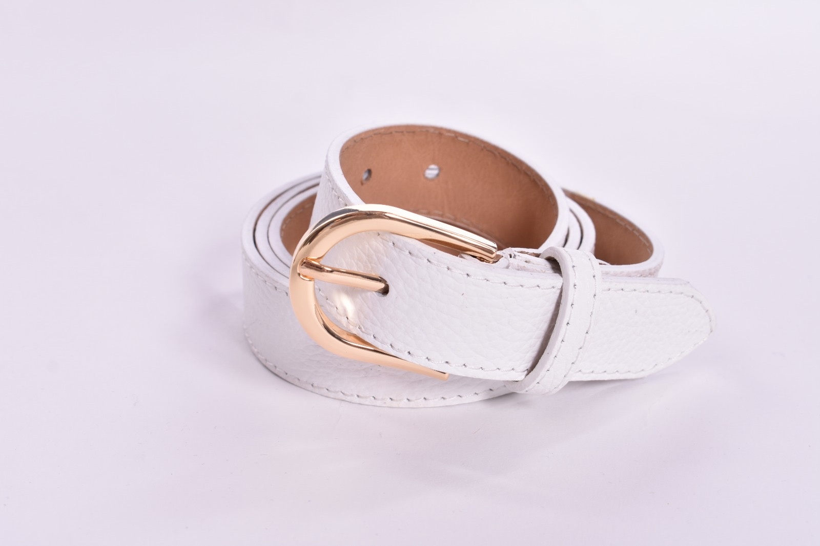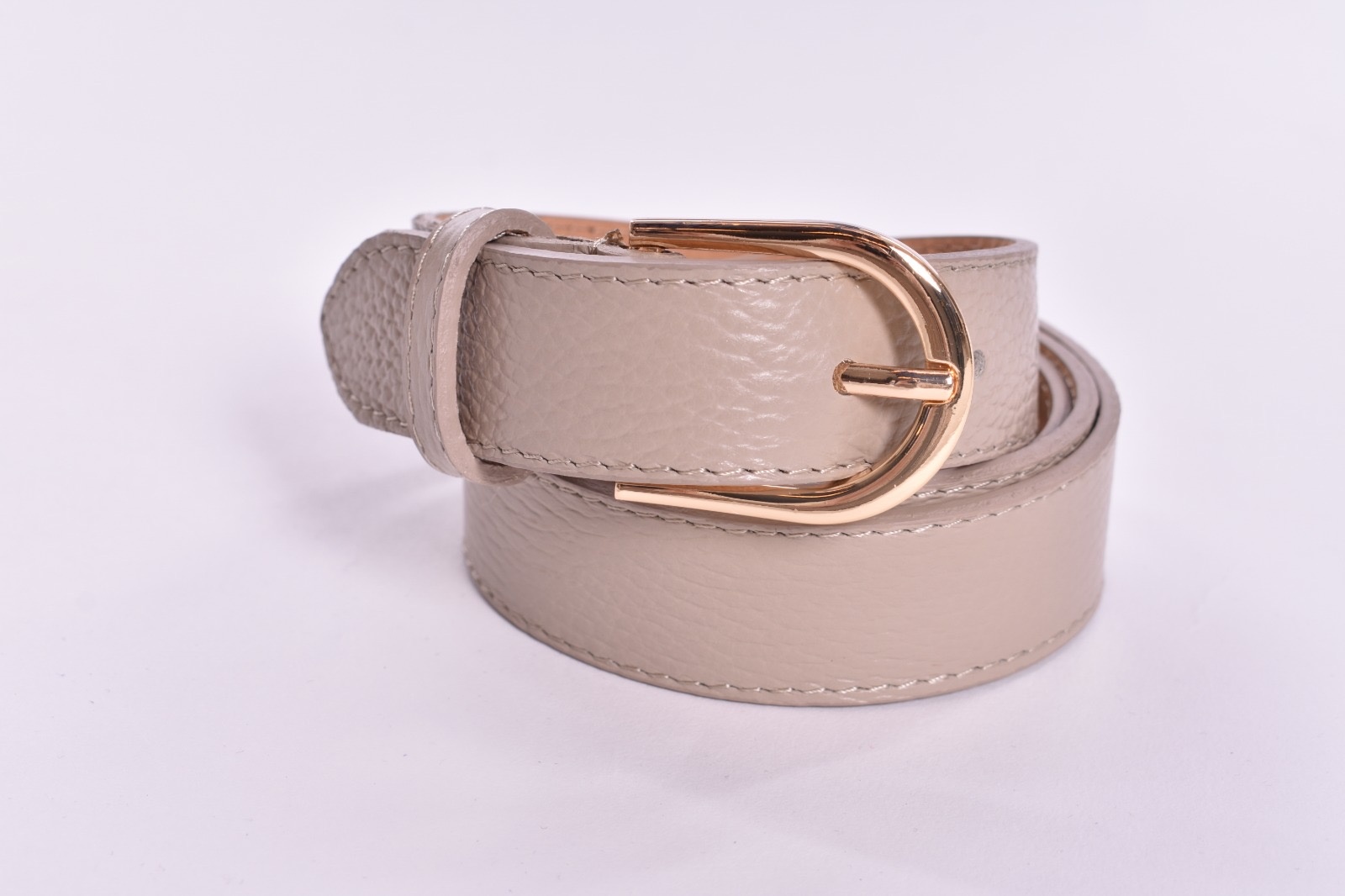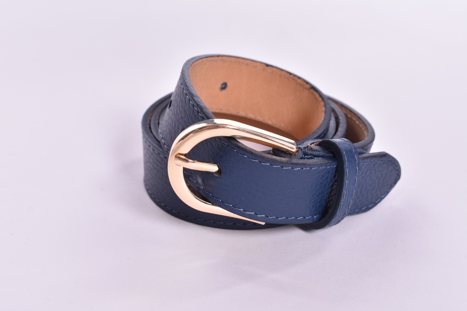 Een ceintuur van echt leer. Het is 100 cm lang en heeft een goud kleurige gesp.