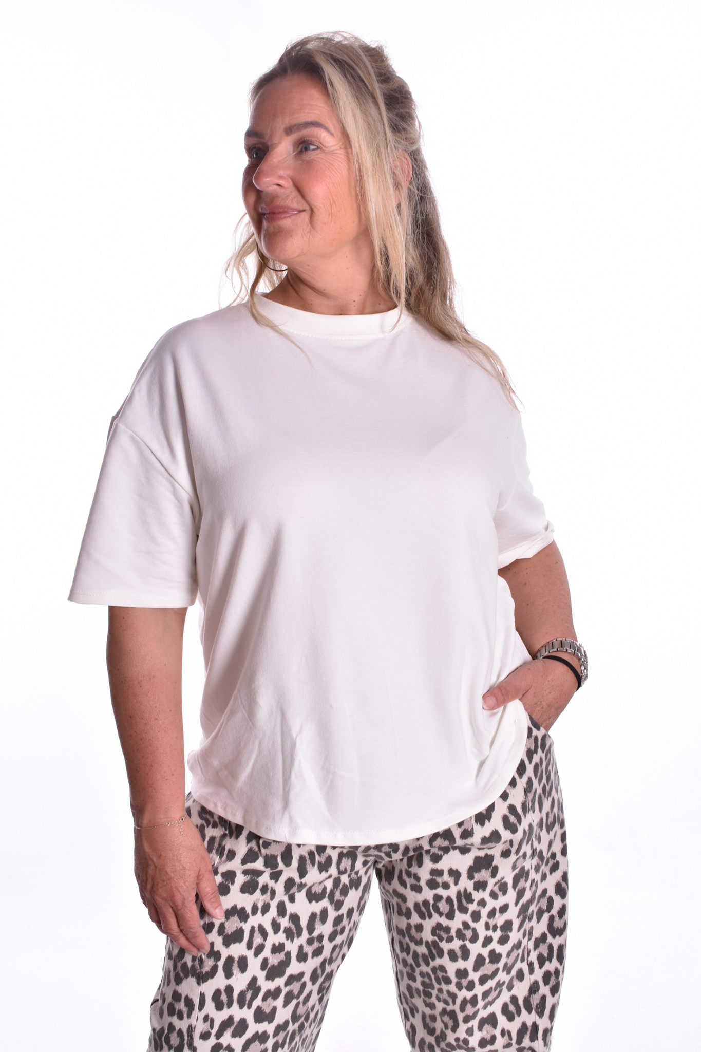 Mooi katoenen basis T-shirt in roomwit met mooie ronde hals, die niet gaat lubberen. Ideaal voor onder blazers.