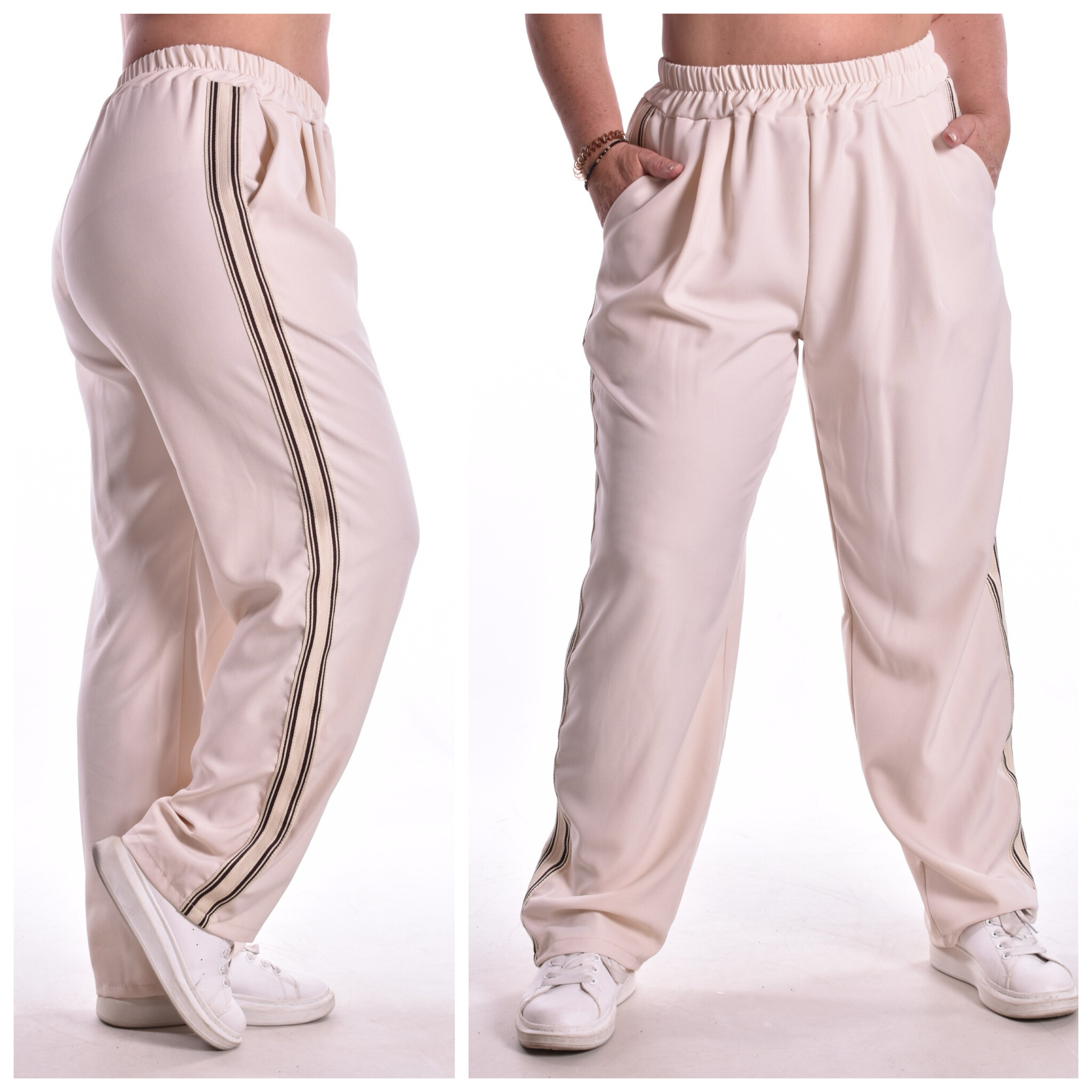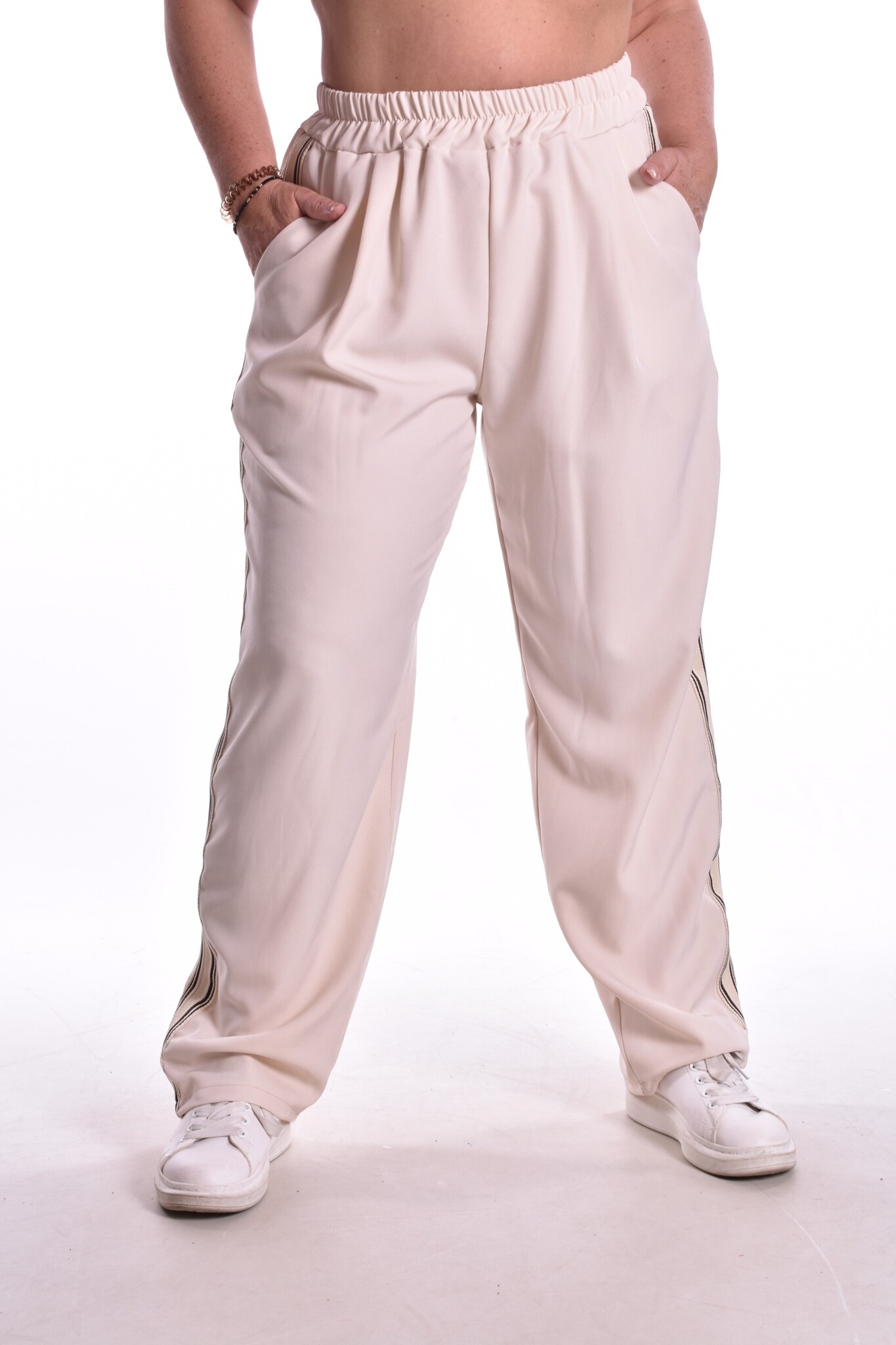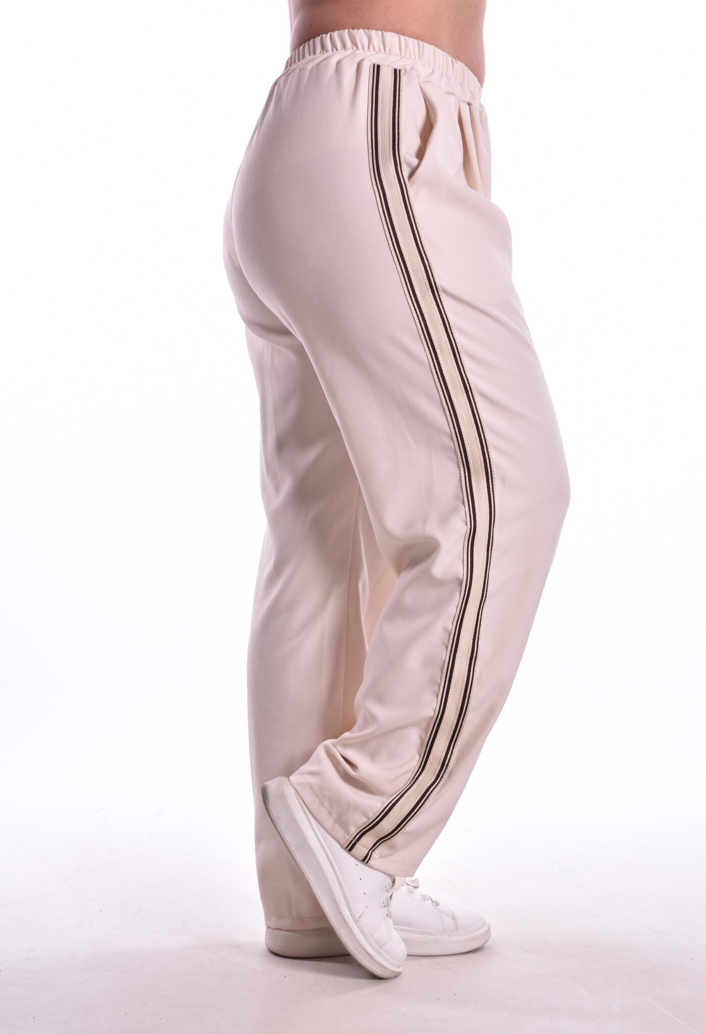 Een ballon broek model met elastieken tailleband, steekzakken en sportief chique bies aan de zijkant.