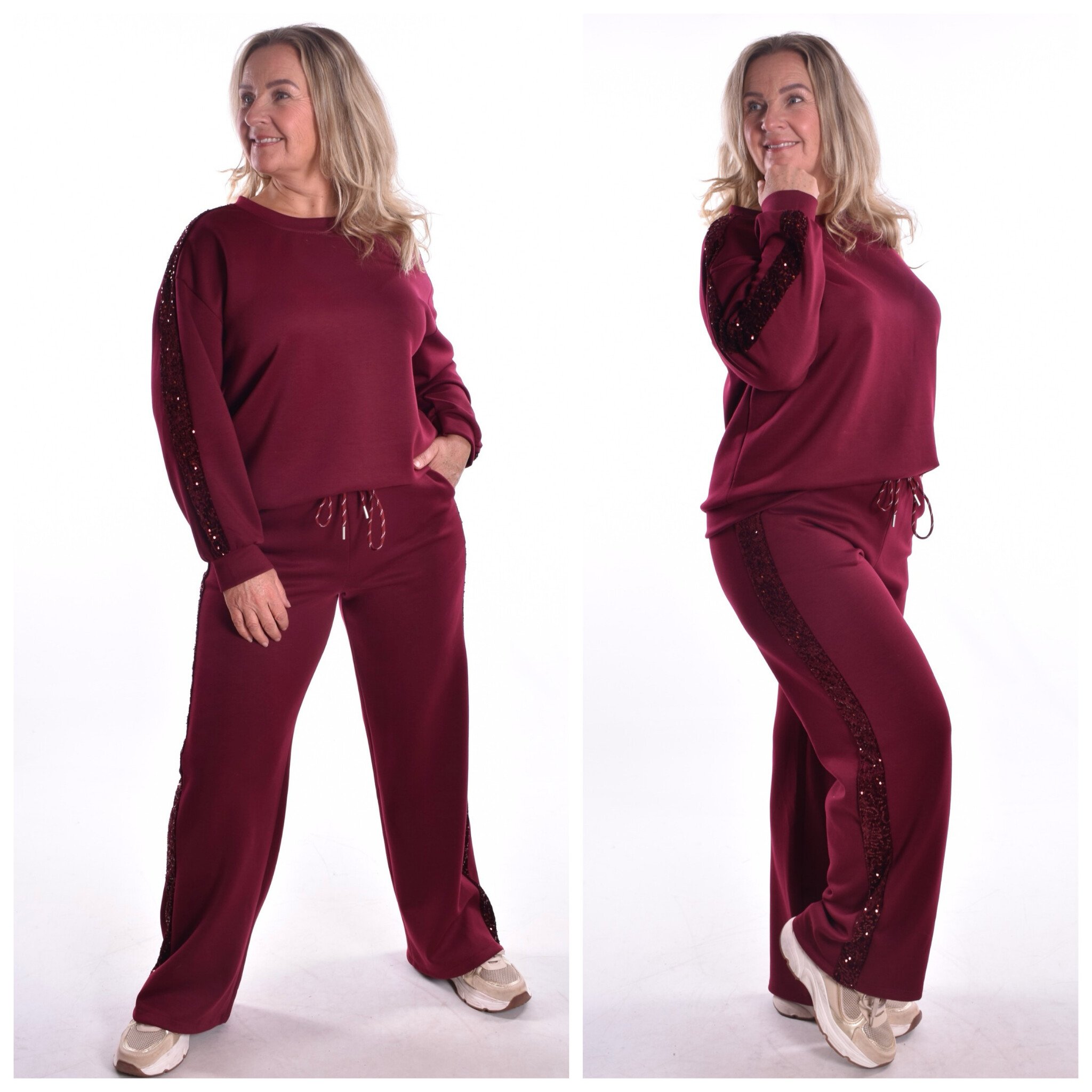 Lekker zacht pak met biezen van lovertjes op de mouwen en op de zijkant van de broekspijpen.