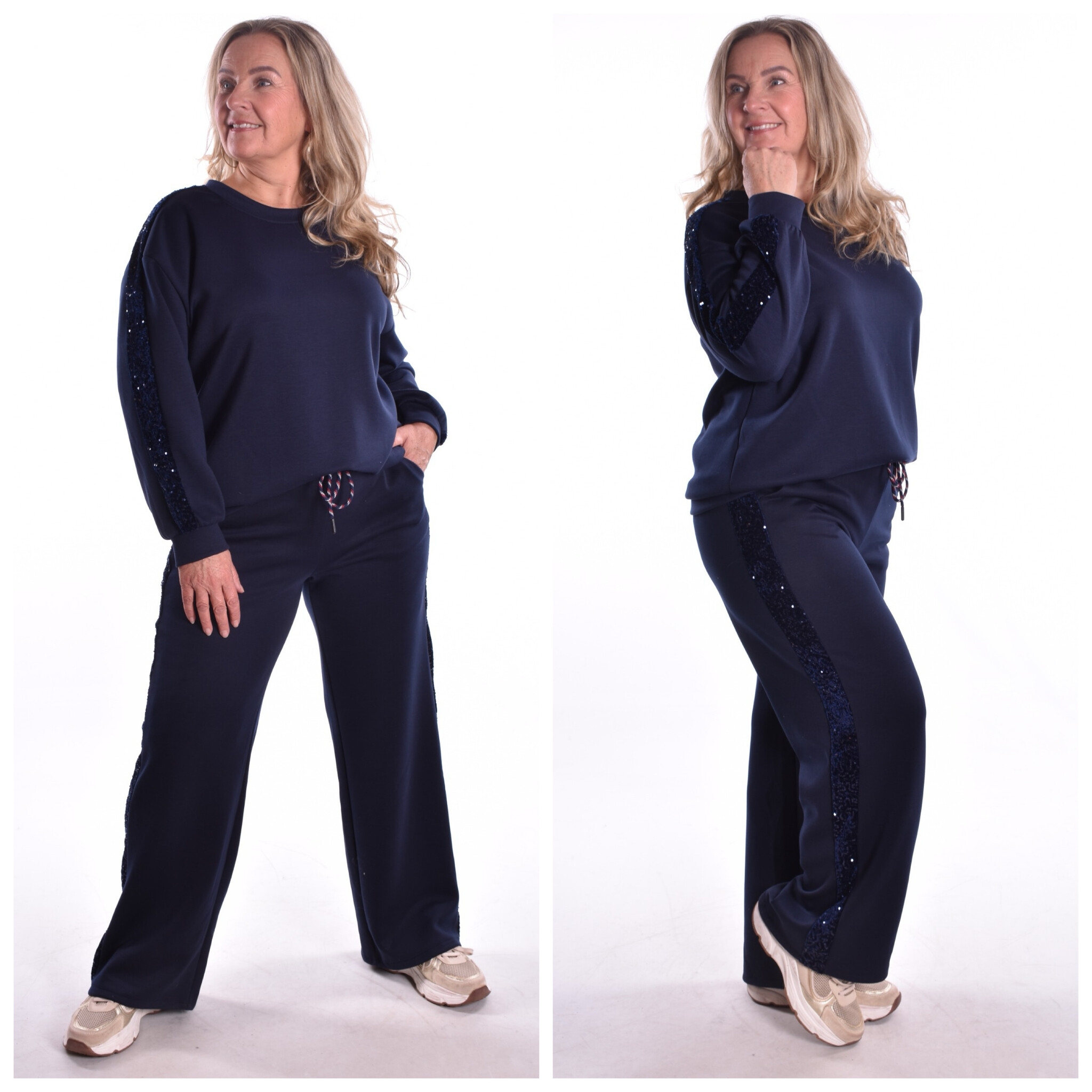 Lekker zacht pak met biezen van lovertjes op de mouwen en op de zijkant van de broekspijpen.