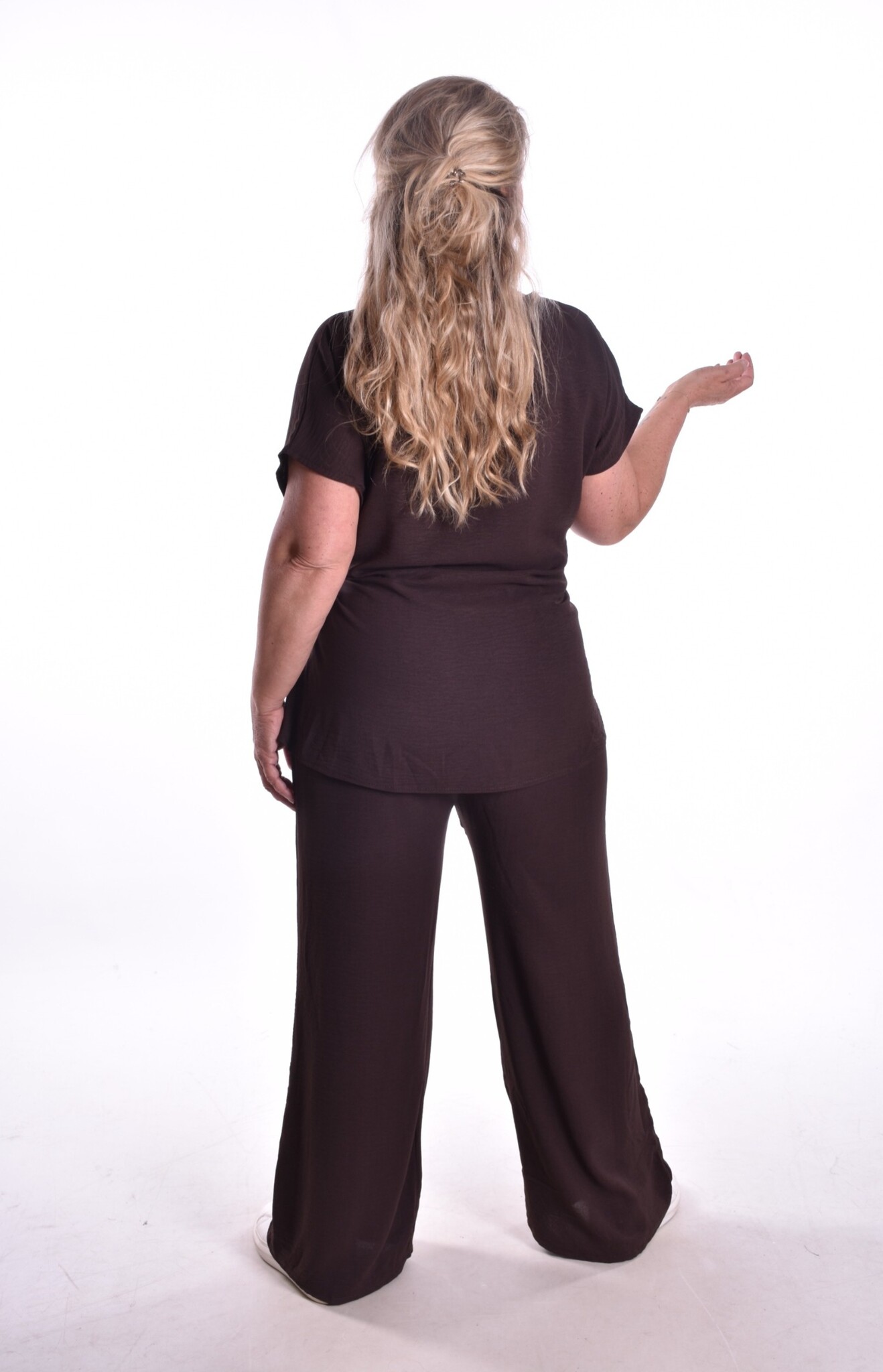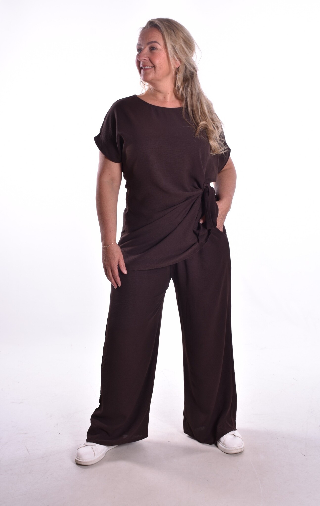 De top heeft een strik aan de zijkant. De broek is voor de kortere dames, met elastiek in de taille en steekzakken. Lekker luchtig stofje.
