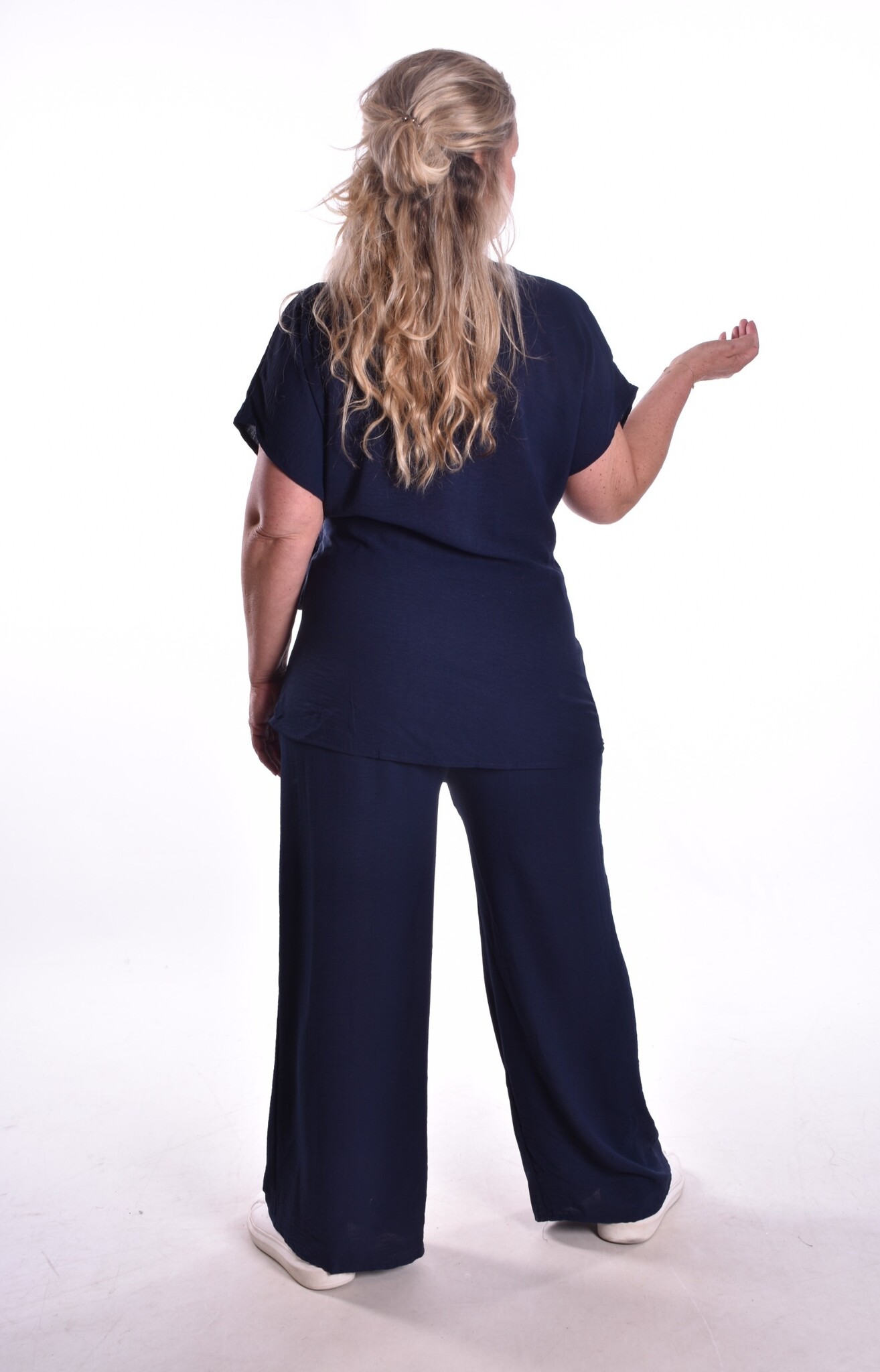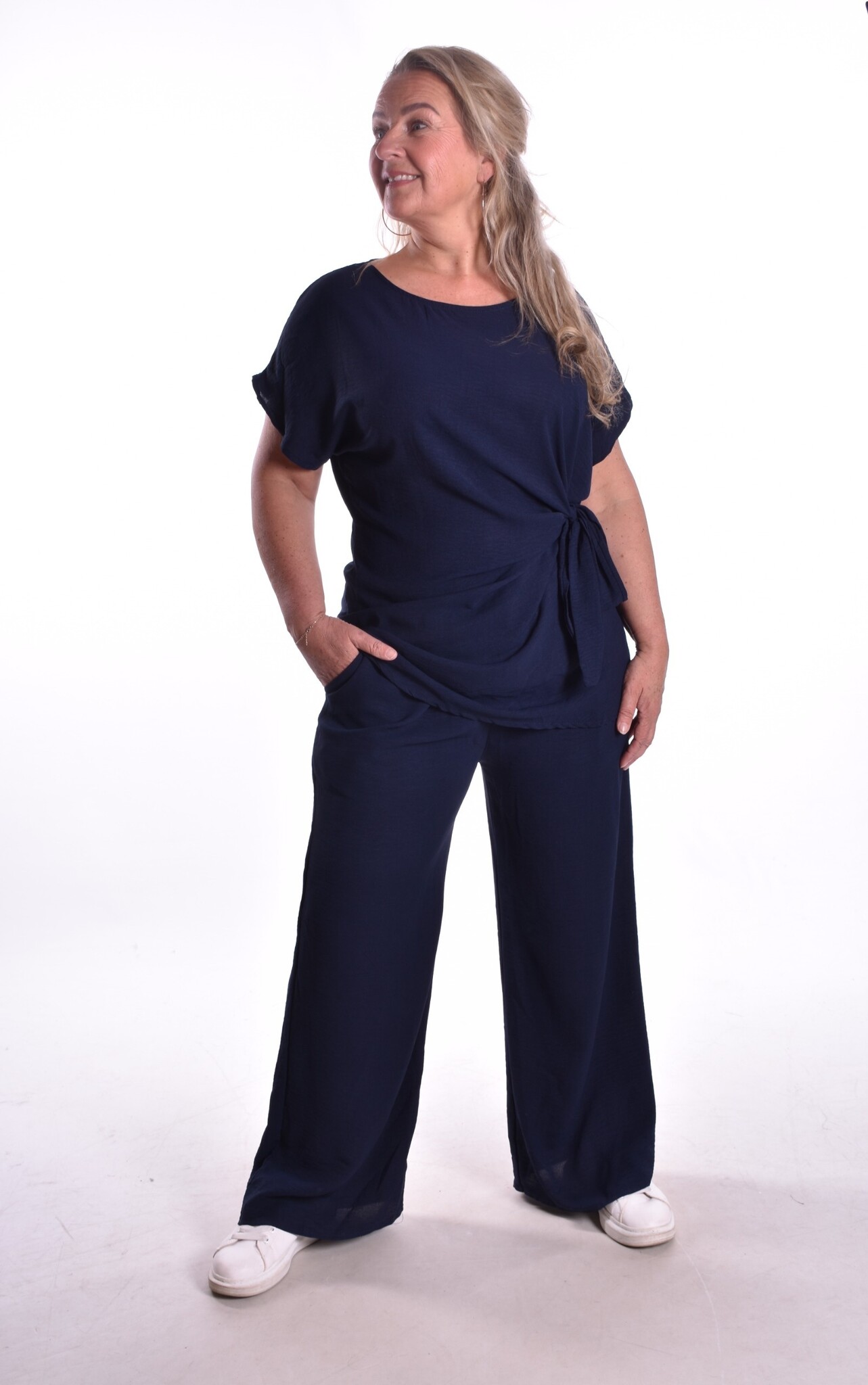 De top heeft een strik aan de zijkant. De broek is voor de kortere dames, met elastiek in de taille en steekzakken. Lekker luchtig stofje.