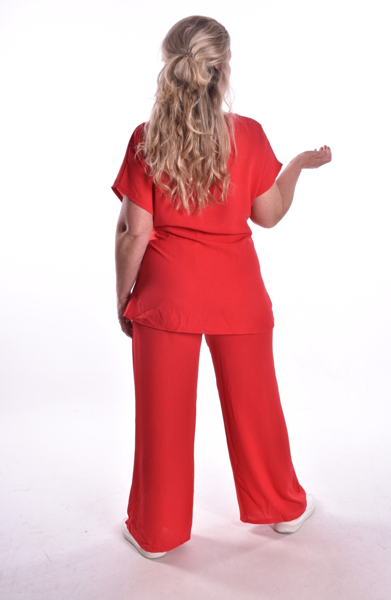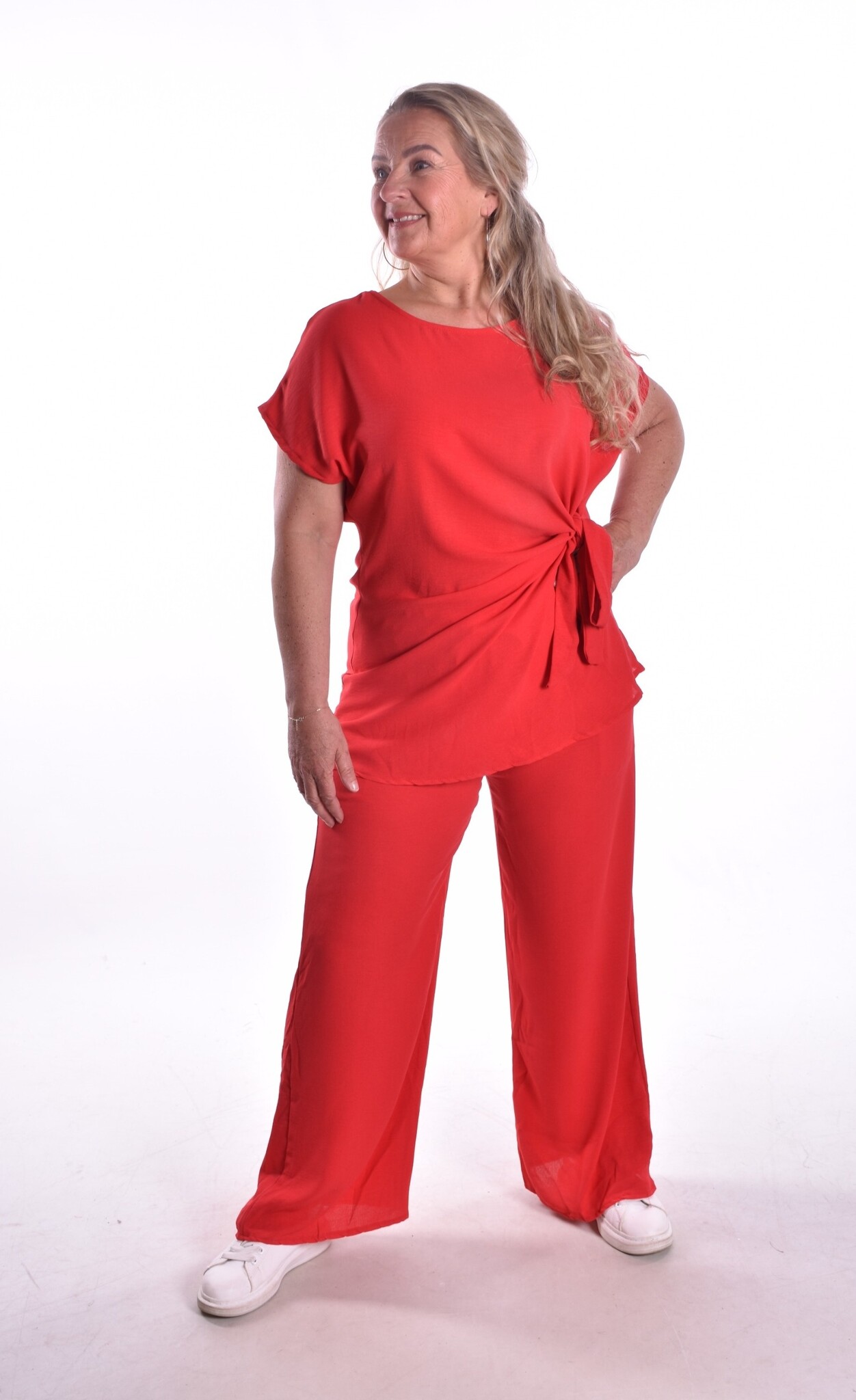 De top heeft een strik aan de zijkant. De broek is voor de kortere dames, met elastiek in de taille en steekzakken. Lekker luchtig stofje.