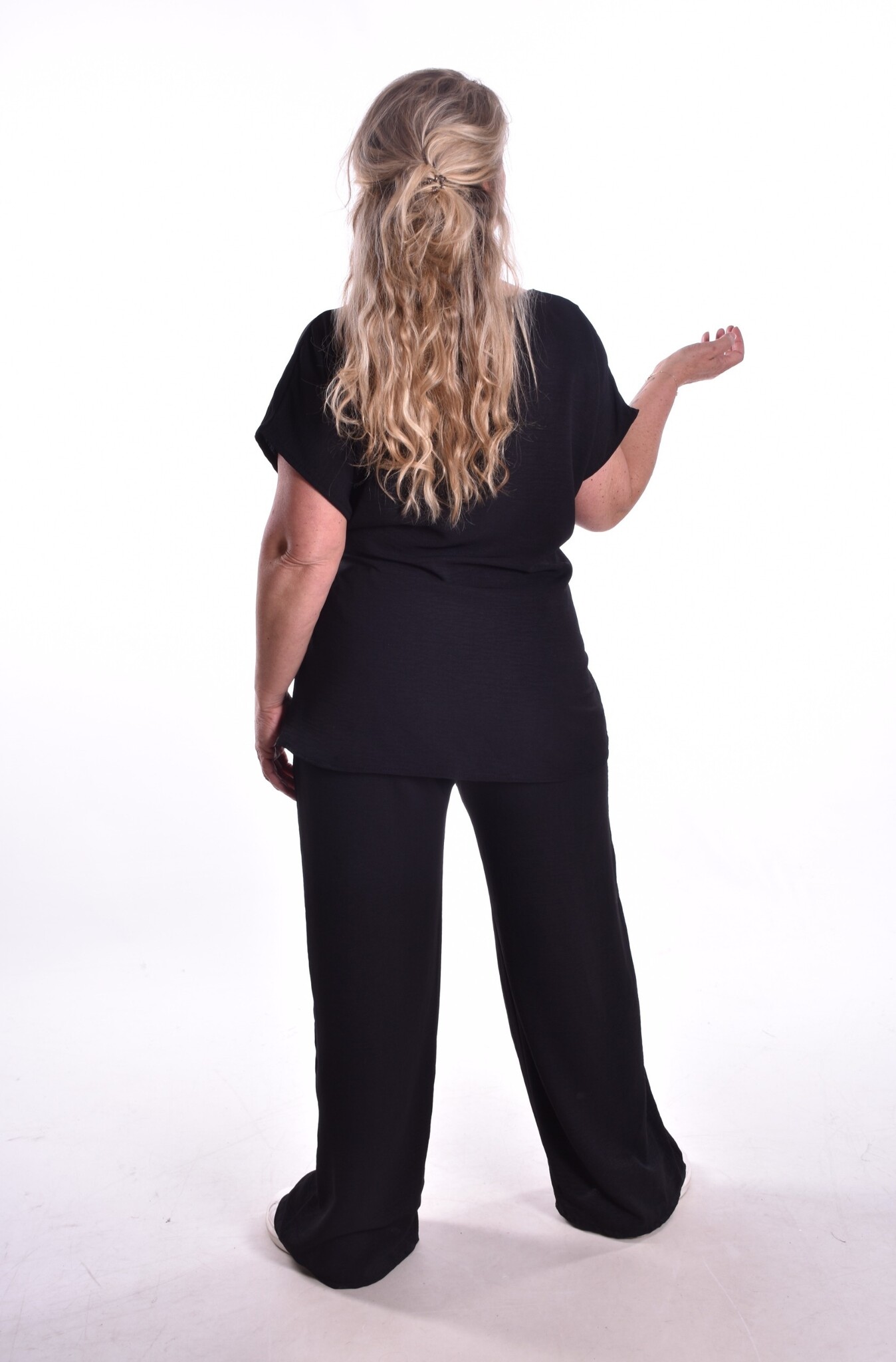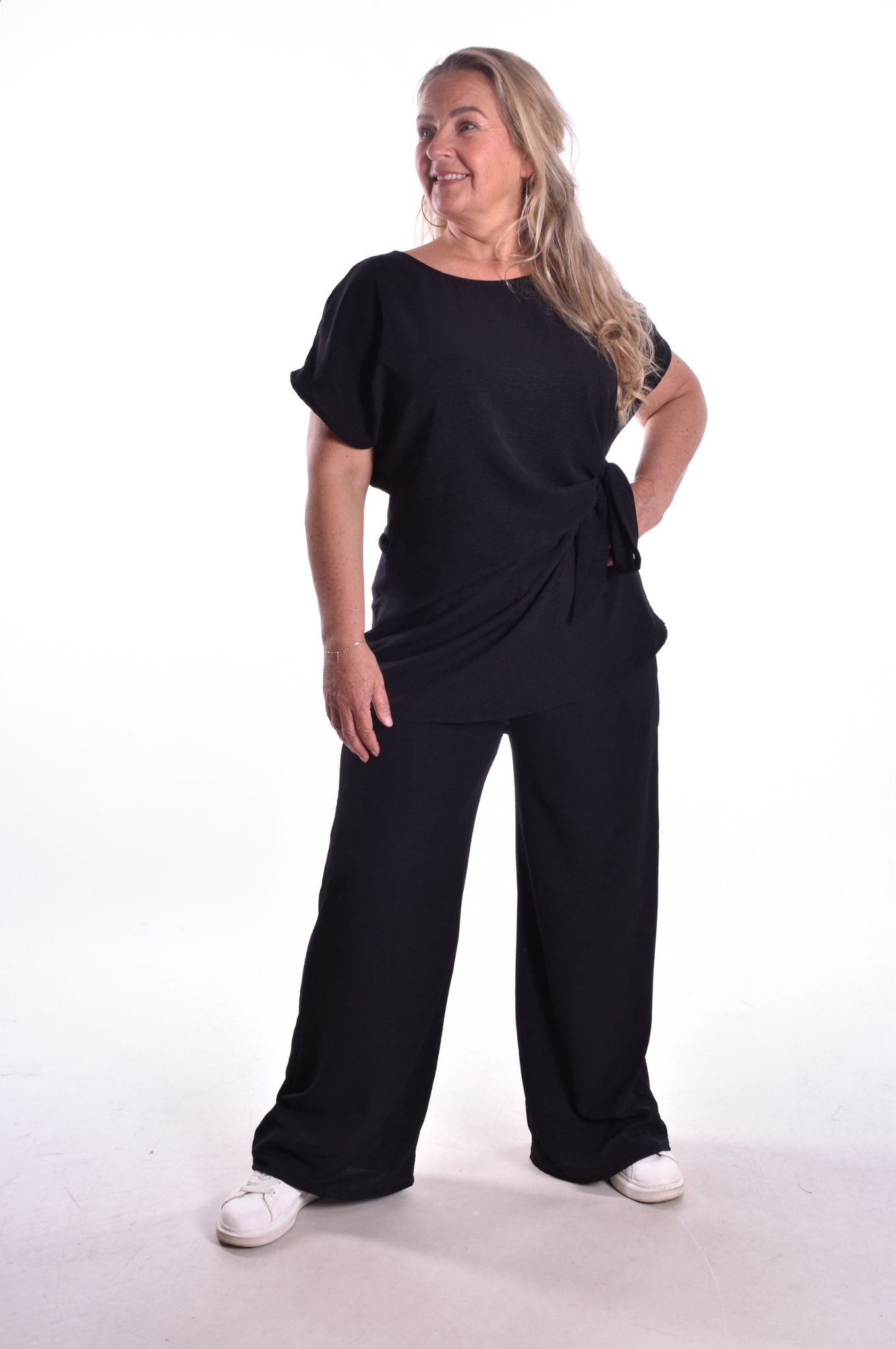 De top heeft een strik aan de zijkant. De broek is voor de kortere dames, met elastiek in de taille en steekzakken. Lekker luchtig stofje.