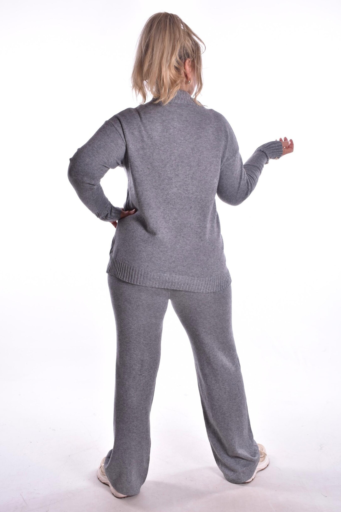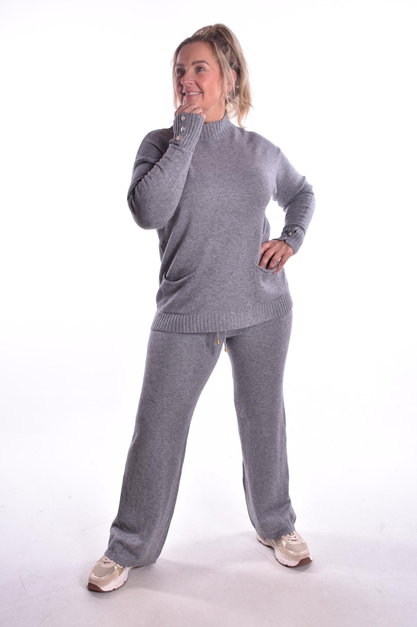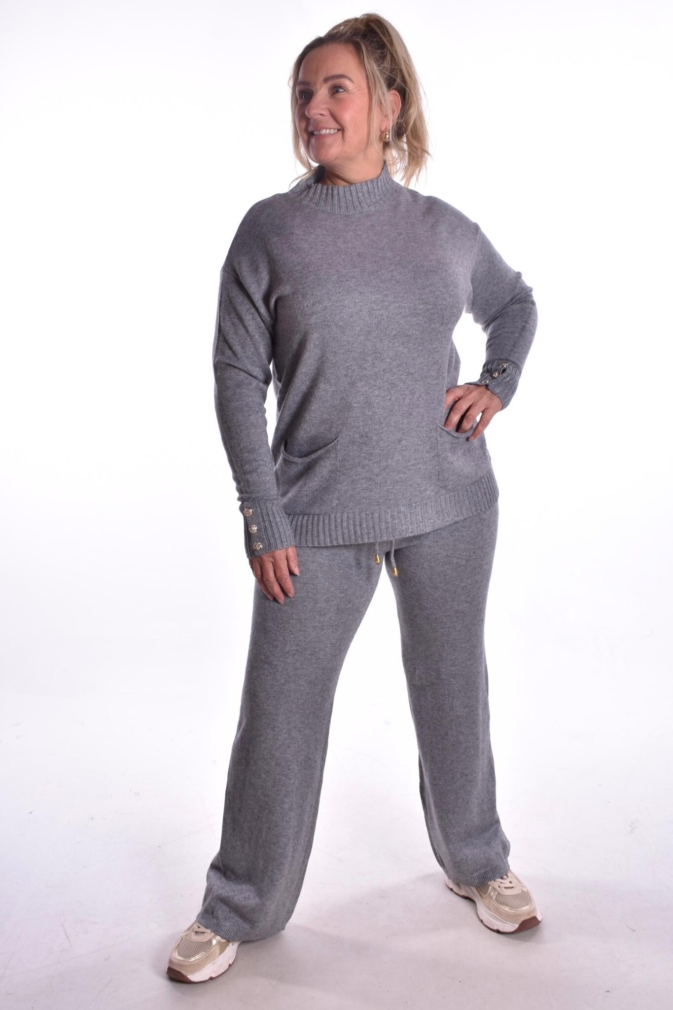 Set Marie is een complete set van zacht fijn breisel, van een mooie kwaliteit met 2 zakjes op de trui en een aanrijgkoordje in de broek. Op de manchetten zitten 3 gouden knoopjes.