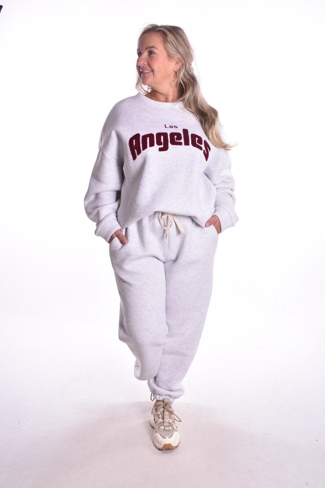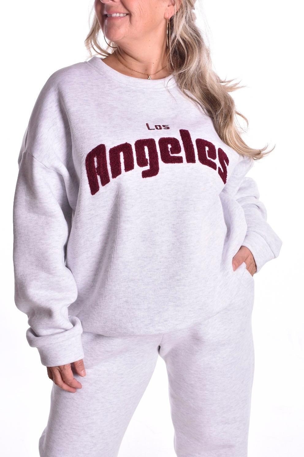 Sweater lazy days is een ruimvallende sweater van het luxe merk Mooij, met super zachte fleece aan de binnenkant en geborduurde bordeaux bouclé letters erop, Los Angeles.