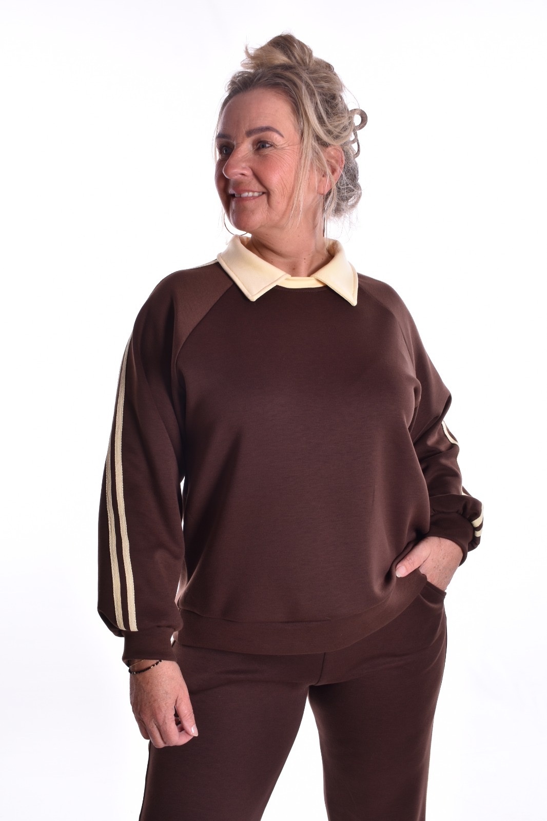 De sweater heeft gekleurde biezen op de mouwen en een gekleurd kraagje wat aan de sweater vast zit.