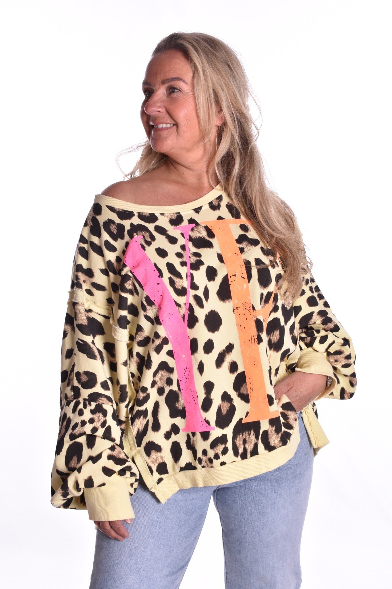 De sweater is er in een maat en wij adviseren dat deze te dragen is t/m maat 46.