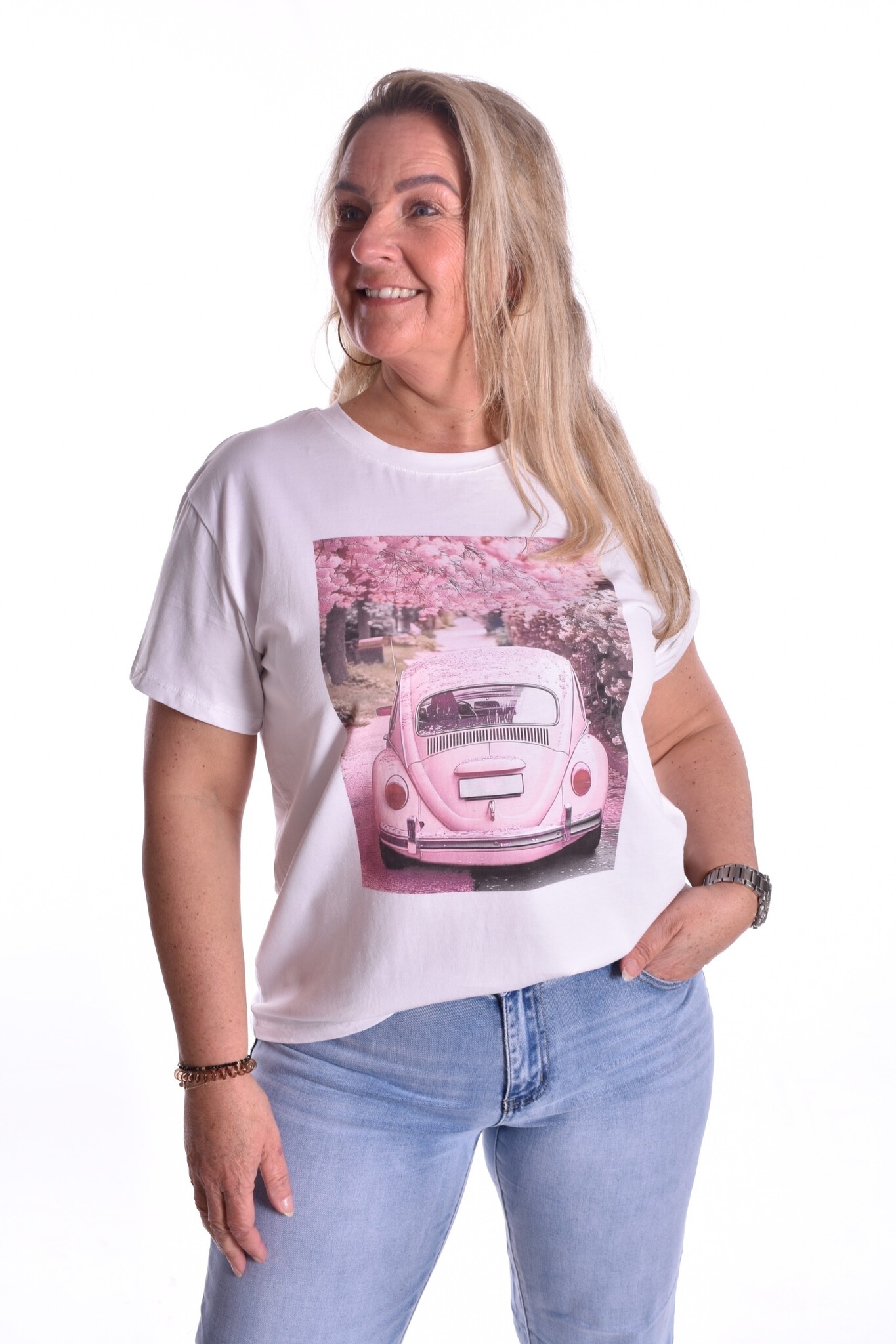 Katoenen T-shirt met print in de kleur roze. Het T-shirt is er in één maat en wij adviseren dat het t-shirt te dragen is t/m maat 42.